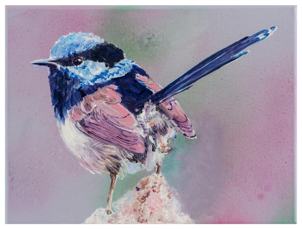 Serie van 5 schilderijtjes over vogeltjes. Het zijn gemengde technieken op linnen. Dit is vogeltje 2 een winterkoninkje . Het is een acryl achtergrond met airbrush gespoten om een fotografische onscherpte te krijgen. Het vogeltje zelf is in olieverf geschilderd. Hierdoor krijg je een fraai scherp onscherp beeld. Meer werk van Lambert Oostrum is te zien op : www.lambertoostrum.nl. In 1987 heeft Lambert oostrum De Alfons Blomme Prijs in Roeselare gewonnen.Meer info is te vinden op zijn website.
