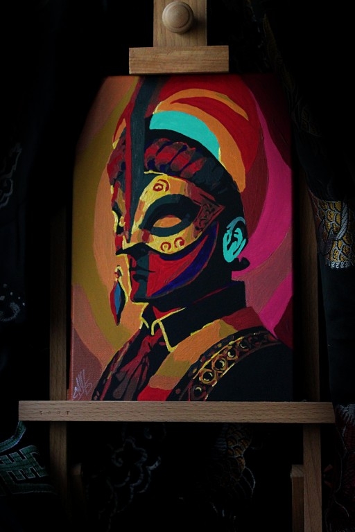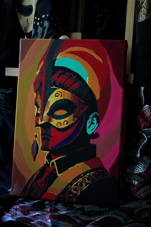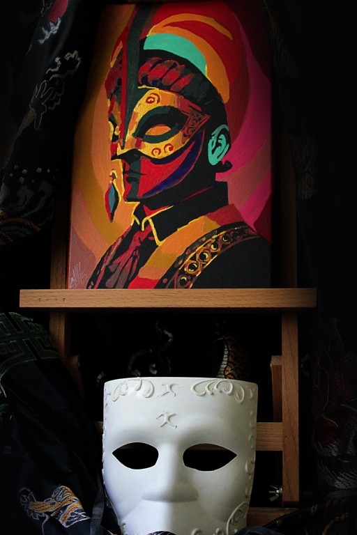 Dessin pop art d'un masque vénitien de carnaval. Fait main. Ouvrage d'auteur, exemplaire unique. L'oeuvre est réalisée sur toile de coton avec des peintures acryliques. La toile est vernie et tendue sur un châssis en bois. Le travail est emballé dans une boîte pour une livraison en toute sécurité. Taille : 20*30cm