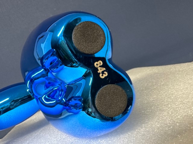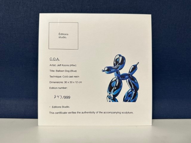 Chien Ballon en 'BLEU'. Emballage d'origine et certificat présent. Il s'agit de la première édition rare limitée à 999 pièces dans le monde. C'est le n° 843. Envoi soigné, rapide et assuré. Plus d'informations: Jeffrey "Jeff" Koons (né le 21 janvier 1955) est un artiste américain dont le travail est dominé par les thèmes de la banalité et de la séduction. Il vit et travaille à la fois à New York et dans sa ville natale de York, en Pennsylvanie. Jeff Koons est sans aucun doute l'un des artistes vivants les plus importants et son travail fait partie des collections (musées) contemporaines les plus importantes au monde. Le mérite de Koons réside dans l'incorporation d'éléments kitsch dans « L'Art avec le A majuscule », ce qui fait que son uvre, dans la lignée de celle d'Andy Warhol, est qualifiée de postmoderne. Le travail de Koon présente des similitudes avec le Pop Art, en ce sens qu'il prend des éléments de l'art inférieur et les intègre dans l'art supérieur. Son travail est considéré comme appartenant à la catégorie Néo Pop Art, où dans le cas de Koons on parle d'überkitsch : un kitsch exagéré à tel point qu'il ne peut plus être apprécié et c'est précisément de là qu'il tire son art. Les uvres de Koons sont vendues pour des sommes astronomiques, par exemple, en 2013 lors d'une vente aux enchères d'art contemporain chez Christie's à New York, Balloon Dog Orange de Koons a été vendu pour plus de 58 millions de dollars, l'uvre la plus chère jamais réalisée pour un artiste vivant. Jeff Koons a réalisé un certain nombre de reproductions limitées du Balloon Dog, qui sont disponibles chez Kunsthuizen.