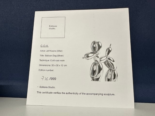 Chien Ballon en 'ARGENT'. Emballage d'origine et certificat présent. Il s'agit de la première édition rare limitée à 999 pièces dans le monde. C'est le n° 736. Envoi soigné, rapide et assuré. Plus d'informations: Jeffrey "Jeff" Koons (né le 21 janvier 1955) est un artiste américain dont le travail est dominé par les thèmes de la banalité et de la séduction. Il vit et travaille à la fois à New York et dans sa ville natale de York, en Pennsylvanie. Jeff Koons est sans aucun doute l'un des artistes vivants les plus importants et son travail fait partie des collections (musées) contemporaines les plus importantes au monde. Le mérite de Koons réside dans l'incorporation d'éléments kitsch dans « L'Art avec le A majuscule », ce qui fait que son uvre, dans la lignée de celle d'Andy Warhol, est qualifiée de postmoderne. Le travail de Koon présente des similitudes avec le Pop Art, en ce sens qu'il prend des éléments de l'art inférieur et les intègre dans l'art supérieur. Son travail est considéré comme appartenant à la catégorie Néo Pop Art, où dans le cas de Koons on parle d'überkitsch : un kitsch exagéré à tel point qu'il ne peut plus être apprécié et c'est précisément de là qu'il tire son art. Les uvres de Koons sont vendues pour des sommes astronomiques, par exemple, en 2013 lors d'une vente aux enchères d'art contemporain chez Christie's à New York, Balloon Dog Orange de Koons a été vendu pour plus de 58 millions de dollars, l'uvre la plus chère jamais réalisée pour un artiste vivant. Jeff Koons a réalisé un certain nombre de reproductions limitées du Balloon Dog, qui sont disponibles chez Kunsthuizen.