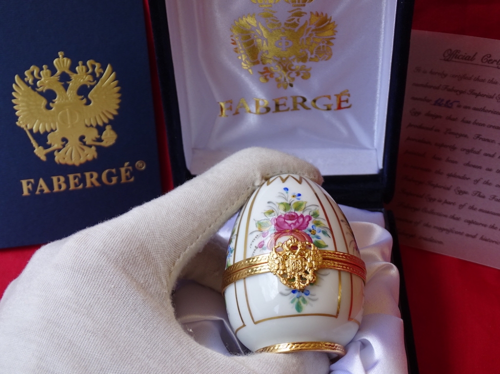 Oeuf Impérial - finition or 24 carats Boîte d'origine incluse plaqué or 24 carats, porcelaine fine de limoges Cet oeuf a été créé exclusivement par la Maison Fabergé. C'est un objet très coté sur le marché de l'art. Oeuf avec une très belle brillance. L'ensemble est en très bon état, excellent. Voir les nombreuses photos pour avoir une bonne idée de tous les détails et des superbes illustrations sur cet uf.