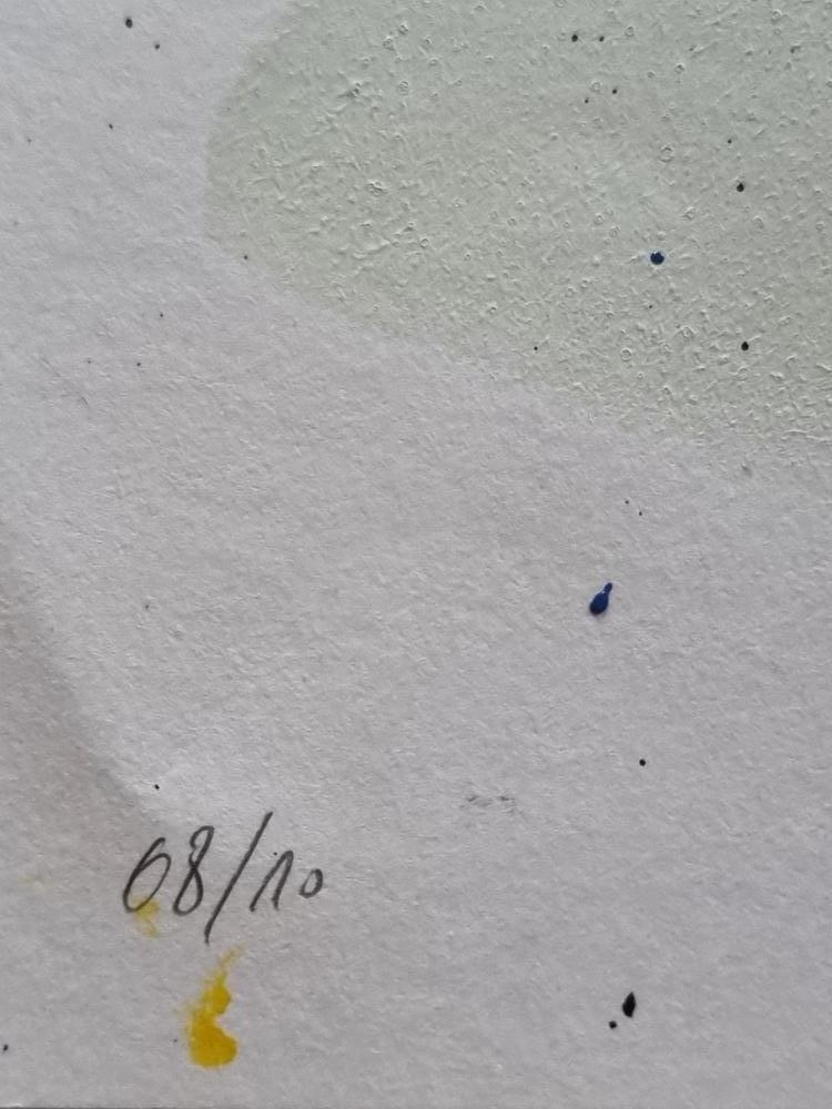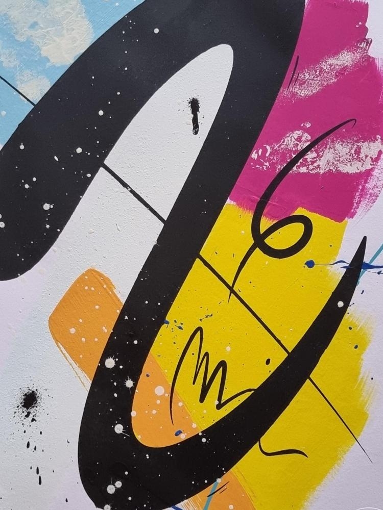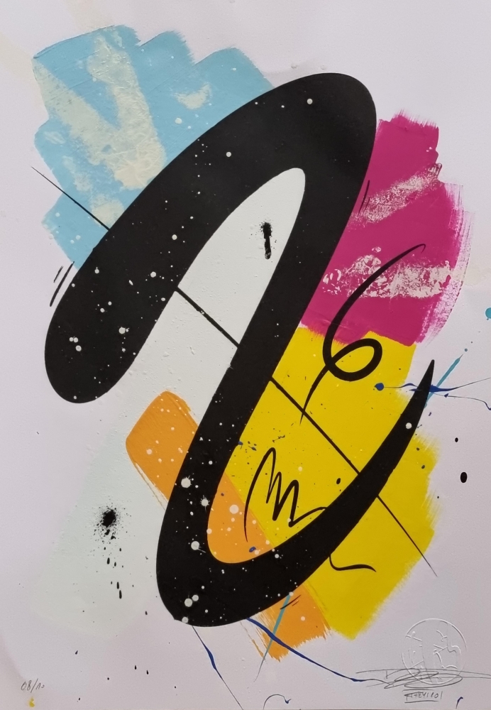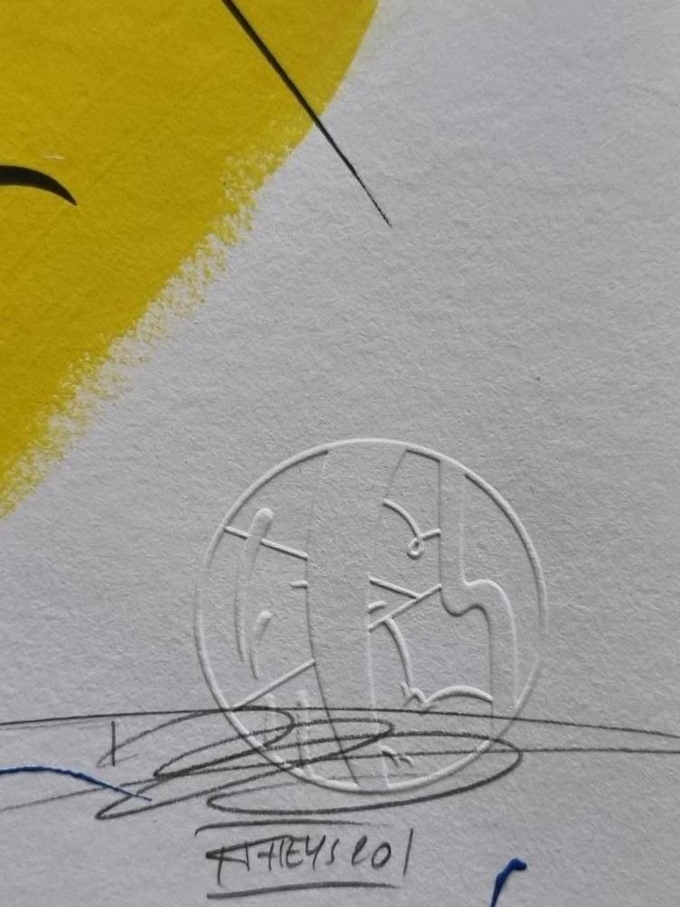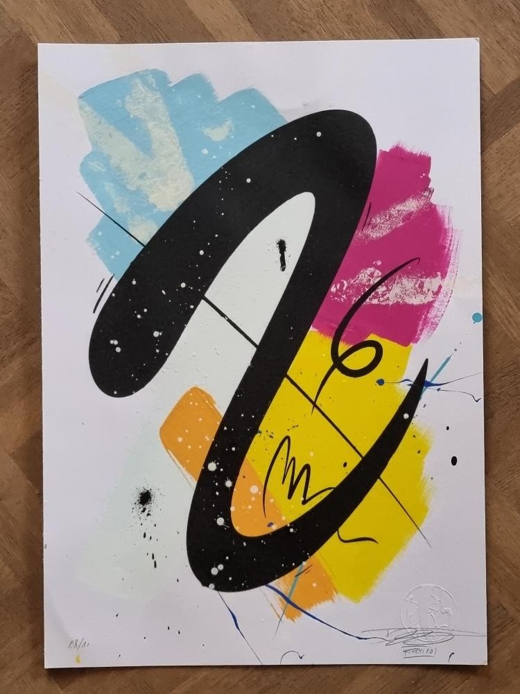 Prachtig werk van de zeer beloftevolle kunstenaar Sébastien Theys. Mixed media werk: Seriegrafie + Acryl + spray (zo is elk werk uniek) Titel: The Blast (reeks van 10 originele werken, dit is nummer 8) Art director, SÉBASTIEN THEYS is also a self-taught graffiti artist who lives in Nivelles. He paints an abstract and colorful universe inspired by urban art. Cartoon characters and black lines energetically break up his paintings and give a dynamic aspect to his work. The colors that regularly appear in his artworks are mainly pink, yellow and blue. Each artwork is the result of an improvisation which allows him to express himself through paint splashes and characters directly coming from his childhood. His abstract work offers the freedom of interpretation but also the possibility to lose oneself in the many colors used. He likes to think that his artworks are a journey inside himself, where the black line represents a timeline leaving many souvenirs behind.