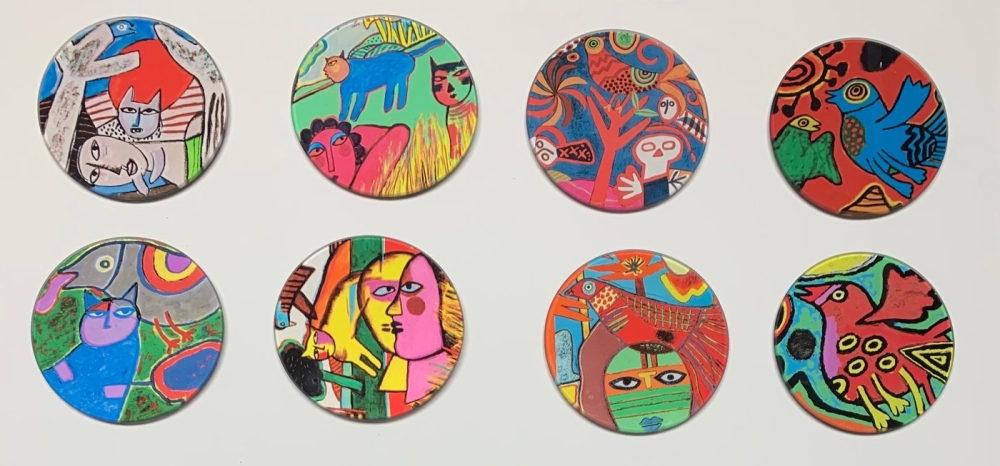 Dans le sillage de Gauguin et de Van Gogh, Guillaume Corneille fut un infatigable et prolixe chantre de la couleur : "La lumière est un vrai bonheur et la couleur est la vie " Superbe ensemble qui crée une explosion joviale de couleurs sur une table de cocktails ou d'apéritifs. Lot comprenant : - 4 Sous-verres / Coasters Chats - 4 Sous- verres / Coasters Oiseaux Dimensions : 10 cm de circonférence. Supports anti-dérapants sur chaque Sous-verre. Deux pièces de rangement en métal Etat parfait Guillaume Corneille (1922-2010), né à Liège de parents Néerlandais, fut l'un des membres fondateurs du groupe Cobra (Contraction de Copenhague, Bruxelles, Amsterdam) avec Karel Appel, Christian Dotremont, Asger Jorn, Constant, et ensuite Alechinsky, entre autres. Les oeuvres du groupe Cobra sont d'une nature sauvage, parfois proche des arts populaires et primitifs, de l'art brut et des enfants. Envoi sécurisé avec UPS avec assurances