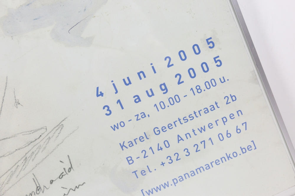 Een affiche voor een expositie van Panamarenko uit 2005. Het werk is ingelijst in een aluminium kader. Komt met echtheidscertificaat van de Panamarenkoshop. De poster is in perfecte tot uitstekende staat.