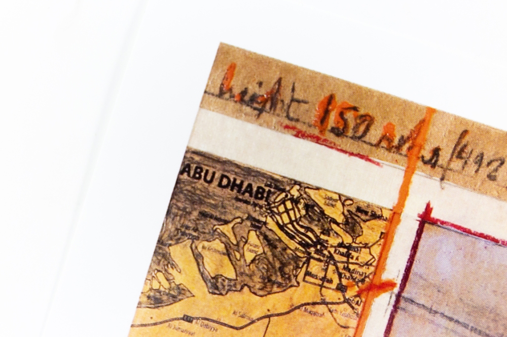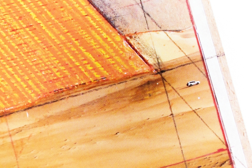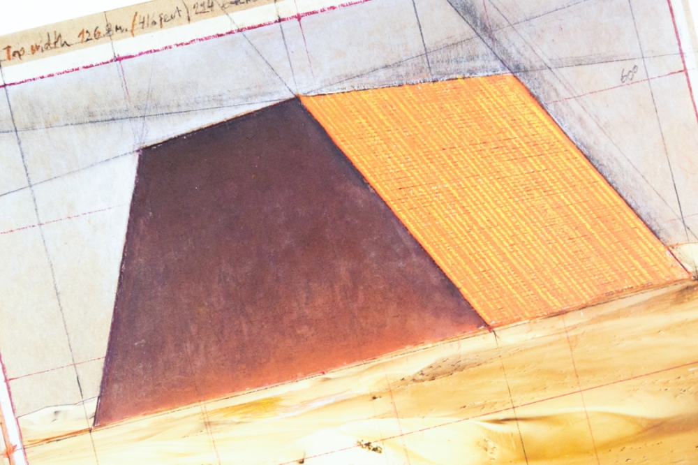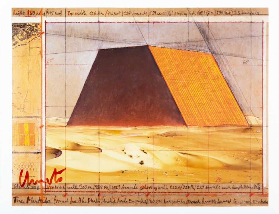 Offsetkleurendruk van "The Mastaba" een ontwerp voor, indien het ooit tot realisatie komt, het grootste sculptuur ter wereld, waarvan het idee al in 1977 het eerste daglicht zag.
