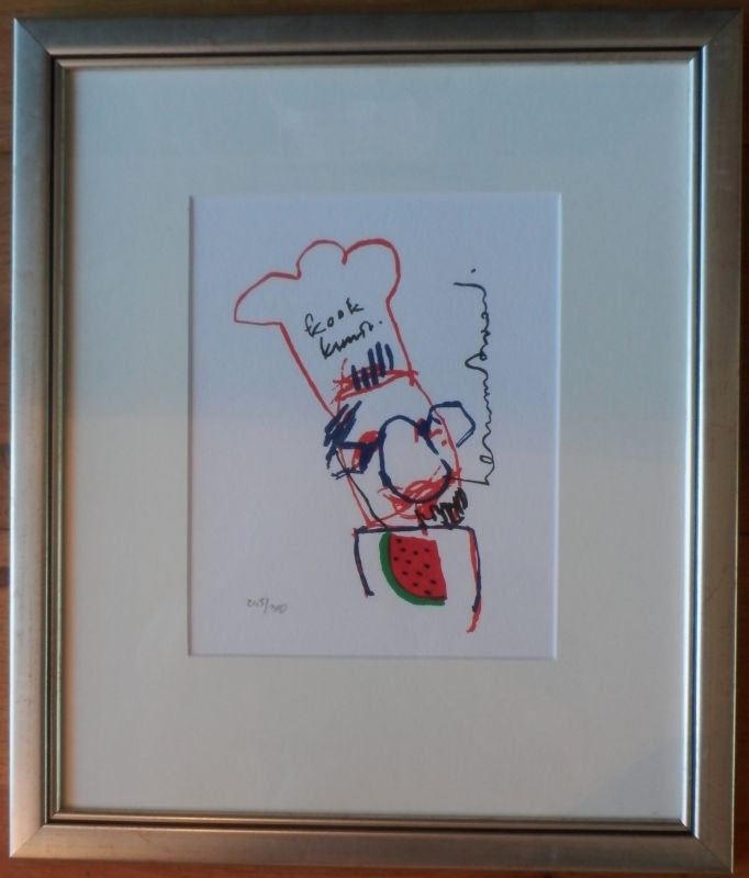 Zeer gezochte en exclusieve kleurenzeefdruk van de bekende Nederlandse Kunstenaar Herman Brood. Afmeting zilverkleurige lijst 34 x 40 cm in perfecte staat. Het werk is in de druk gesigneerd en genummerd 255/350