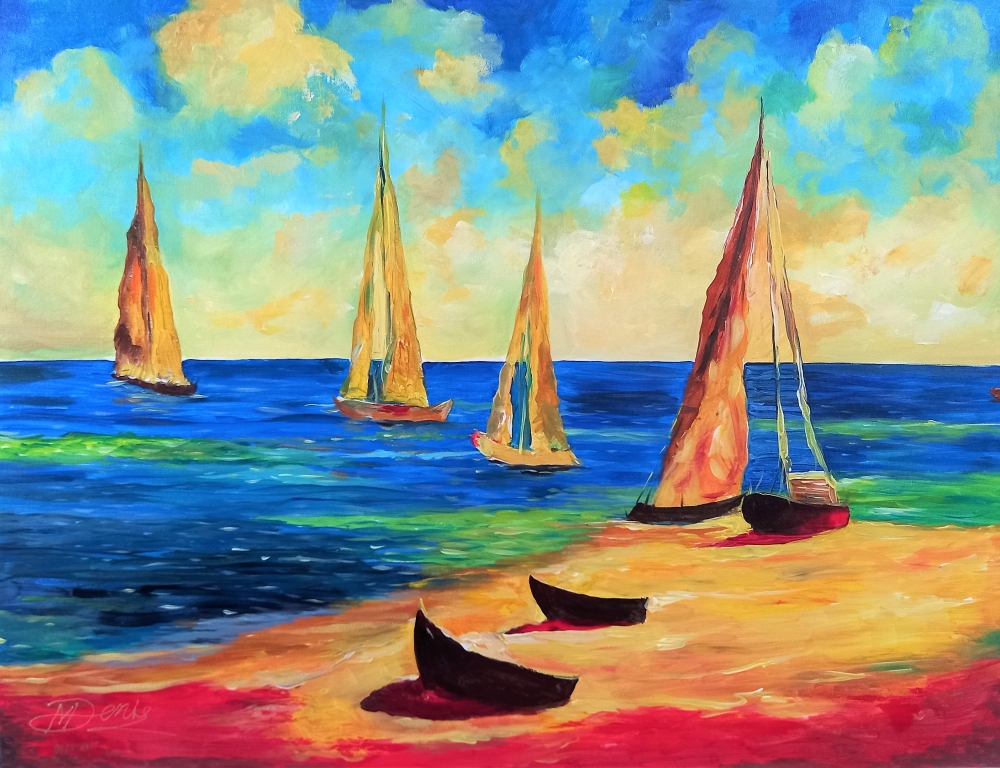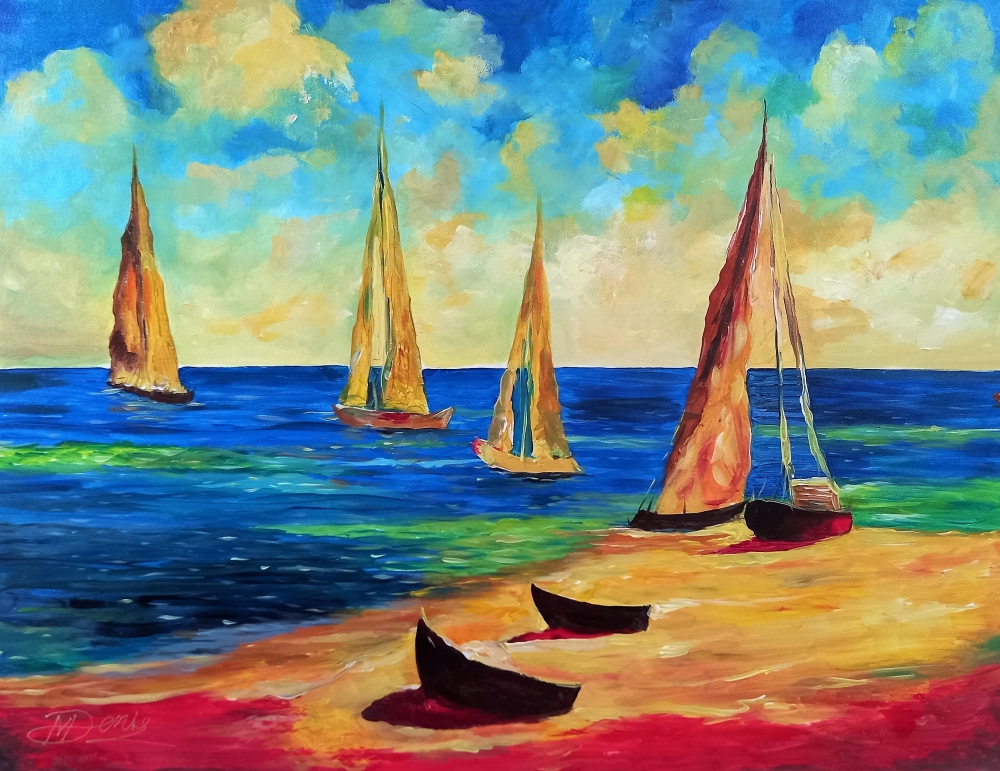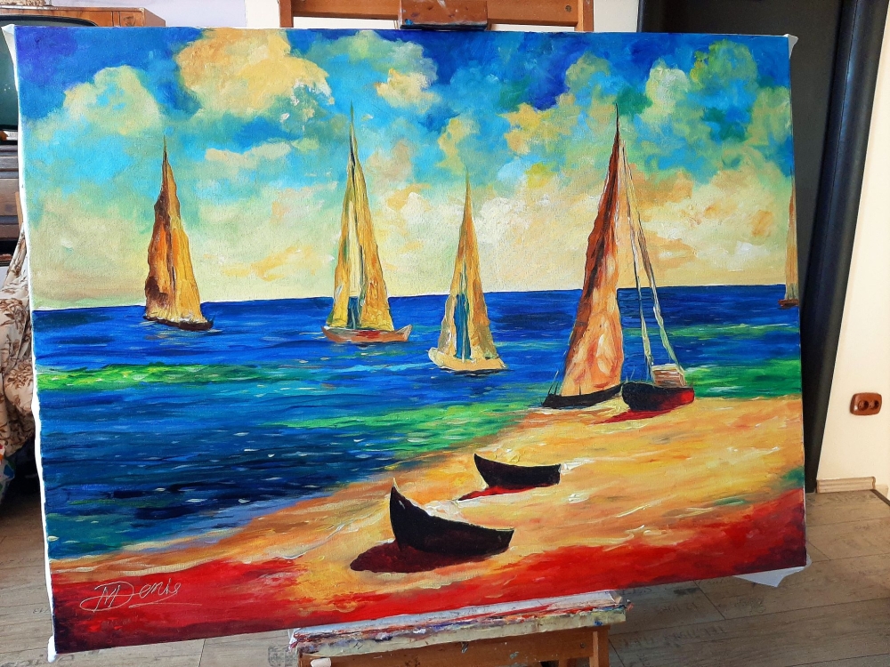 Vele-abstract style,dimension 90/120cm,acrilic on canvas,signed Denis Mihai. The work was created in 2023 by the artist painter Denis Mihai. - The seller is the painter of this work. - Comes with a hand-signed certificate of authenticity from Denis Mihai. - The work is in excellent condition. - Canvas with white primer,acrilic colors were used, made in Italy, super quality. - The canvas is delivered rolled. - The canvas will be delivered without a wooden frame. - Shipping is done by roll, by means of a recognized courier service. - Worldwide delivery is possible. Denis Mihai,graduate of the Ploiesti Popular Art College,graduated the Law Institute from Bucharest, had as his master the famous Romanian painter Dan Platon, one of the most valuable and appreciated Romanian painters, a member of the Union of Plastic Artists from Ploiesti (1931-2006).He easily approaches both the classic and the modern, abstract style. Attentive to both form and color, the painter Denis Mihai tries to capture the essence of matter and add a superb color to them.Painting was a passion, not a job. Working as an entrepreneur for many years, painting has been a breath of fresh air, over the years, the best friend, whom she will never give up.