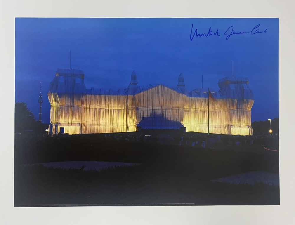 Édition photo par Christo & Jeanne-Claude. Signé à la main au marqueur par Christo & Jeanne-Claude. Le « Packed Reichstag Building » à Berlin était un projet artistique temporaire réalisé par le duo d'artistes Christo et Jeanne-Claude. Le projet s'est déroulé du 24 juin au 7 juillet 1995 et impliquait l'emballage complet du bâtiment du Reichstag à Berlin, bâtiment historique et symbolique en Allemagne. Christo et Jeanne-Claude ont utilisé environ un million de pieds carrés de tissu argenté pour envelopper le bâtiment, ainsi qu'un kilomètre de corde bleue. L'objectif du projet était de transformer et de mettre en valeur le bâtiment du Reichstag, tout en modifiant temporairement son architecture et sa signification politique. Le projet était un immense spectacle et a attiré beaucoup d'attention et de visiteurs. L'achèvement du bâtiment du Reichstag était emblématique des uvres de Christo et Jeanne-Claude, connus pour leurs installations artistiques à grande échelle qui ont changé l'environnement et la façon dont les gens perçoivent leur environnement. Le projet est considéré comme un moment fort de leur carrière et reste un moment important dans lhistoire de lart contemporain. Le bâtiment du Reichstag a bien sûr été à nouveau dévoilé après le projet, mais il reste un rappel emblématique de la vision créative de Christo et Jeanne-Claude.