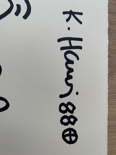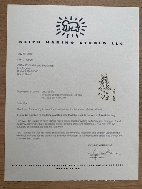 Super mooie tekening door Keith Haring uit 1988. Deze tekening heeft humor en alle kenmerkende elementen in zich waar Keith Haring voor staat. De radiant baby wordt opgetild door de kenmerkende mannetjes van Keith Haring. Dit werk is nog nooit eerder op de markt geweest. Keith Haring was samen met Andy Warhol en Michael Basquiat toonaangevend in de Pop Art Scene in de jaren 90 van de vorige eeuw. Zijn werk wordt steeds zeldzamer en duurder. Het werk is ingelijst. Materiaal: zwarte viltstift op papier. Gesigneerd door Keith Haring aan de rechterzijde. Afmeting: 26,2 x 19,2 cm. Een certificaat afgegeven door Keith Haring Studio LLC, estate of Keith Haring wordt meegeleverd. Deze verklaring is afgegeven op 13 mei 2010 en ondertekend door Julia Gruen. Julia Gruen werkte met Keith Haring vanaf 1984 als zijn studio manager en is nu executive director emeritus van de Keith Haring Foundation. Provenance: Chrystys Art and Book Shop vervolgens Belgische verzamelaar. De Chrystys Art and Book Shop verkocht losse tekeningen van Keith Haring. Door de Keith Haring Foundation worden geen certificaten meer uitgegeven. Echter door dit certificaat uit 2010 wordt wel de echtheid bevestigd van deze schets. De Estate bevestigd dat het een work of Keith Haring is at that time.