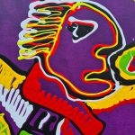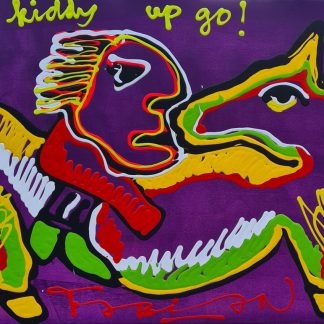 HIER EEN kunst werk , dat de naam volop eer aangeeft , MAN en PAARD ,oftewel",, KIDDY UP GO ", een werk dat met acryl verf gemaakt is , er zijn in deze serie slechts ,,enkele "met deze titel en hun gewicht ten volle waard.