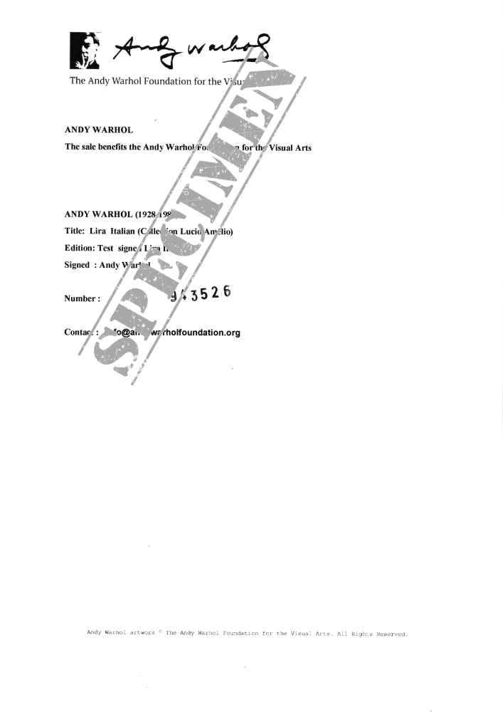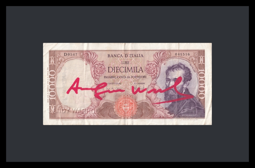 Signé à la main au stylo feutre rouge par Andy Warhol sur un vrai billet de 10.000 lires, première édition 1962. Numéroté avec cachet d'usine et cachet en relief © Andy Warhol. Hologramme 'vérification d'authenticité' au dos. 15,8 x 7,8 cm. Avec certificat de la 'The Andy Warhol Foundation for the Visual Arts'. Les billets Warhol Lira sont plus rares que les billets d'un dollar. Tous les billets étaient en circulation, comme l'artiste le voulait. Andy Warhol a passé 2 ans en Italie avec Lucio Amelio, le marchand d'art d'Andy Warhol, où les billets étaient également produits à cette époque. Détails du recto : au centre en bas, un sceau en rouge avec la tête de « Méduse ». A droite en violet foncé, un portrait de Michelangelo. Quatre combinaisons de signatures avec Le Gouverneur et Le Caissier. Détails du verso : au centre, une vue sur la place du Capitole (en italien : Piazza del Campidoglio).