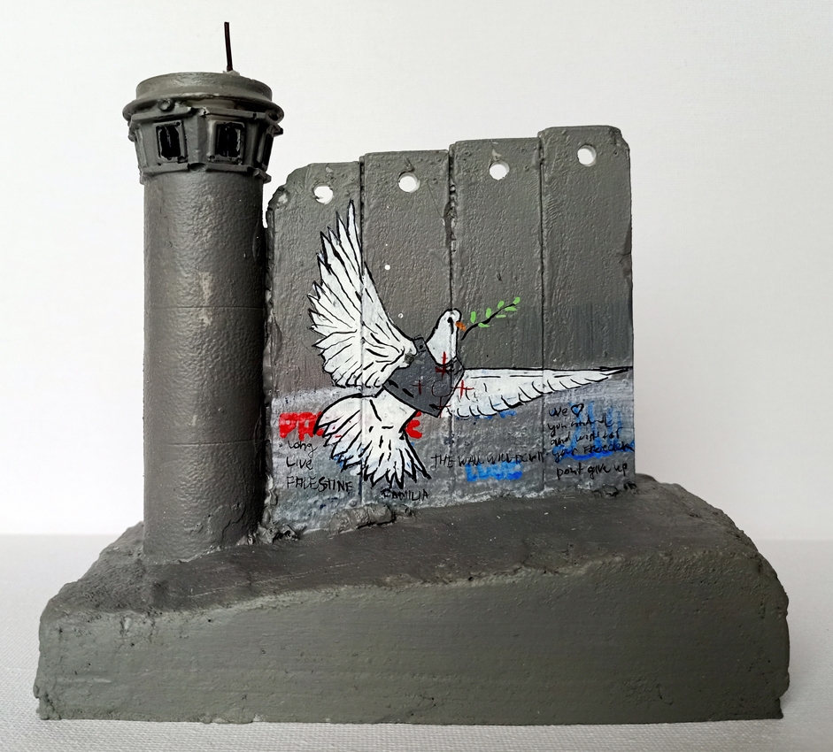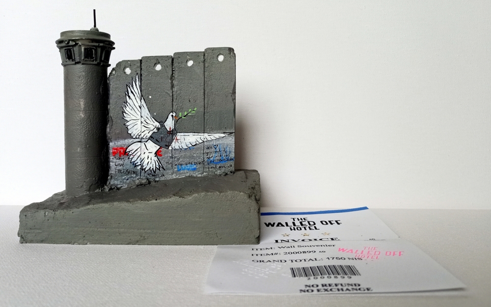 Banksy (attribué) Sculpture de section murale d'hôtel « Longue vie » (#0561) Ultra rare 5 pièces incluant Tourelle, réalisée avec sa propre base. Réception et numéro d'article : 2000899 4D. Taille: 13x13x8cm. Livré avec un reçu d'hôtel numéroté original et une carte de visite The Walled Off Hotel. La statue est peinte à la main par des artisans palestiniens locaux, coulée en résine coulée. Cette pièce est - et sera - EXTRÊMEMENT collectionnable, et ces sculptures souvenirs de sections murales sont maintenant ÉPUISÉES. Cette uvre d'art était uniquement en vente à l'hôtel Banksy à Bethléem, en Palestine et est unique en son genre. Seules très peu de pièces de cette uvre dart ont été réalisées. Les sculptures du Walled Off Hotel de Banksy sont des souvenirs conçus et conçus par Banksy et fabriqués par des artisans locaux. Fabriqué en édition limitée non numérotée. ÉPUISÉ!! Le Walled Off Hotel est un hôtel de charme conçu par l'artiste anonyme Banksy basé à Londres aux côtés d'autres créatifs. Il est situé à Bethléem, à 40 kilomètres (25 mi) de l'aéroport Ben Gourion. Créé en mars 2017 et initialement destiné à n'être qu'une exposition temporaire, l'hôtel a depuis attiré près de 140 000 visiteurs, en partie grâce à son emplacement en face de la partie de la barrière israélienne de Cisjordanie séparant Bethléem du lieu saint du tombeau de Rachel. L'hôtel est considéré comme un élément clé du commentaire social sur les Palestiniens touchés par le conflit israélo-palestinien et présenté comme ayant « la pire vue de tous les hôtels au monde ». Les photos font partie de la description, voir photos pour juger par vous-même de son état général. Être emballé et envoyé en toute sécurité dans le monde entier
