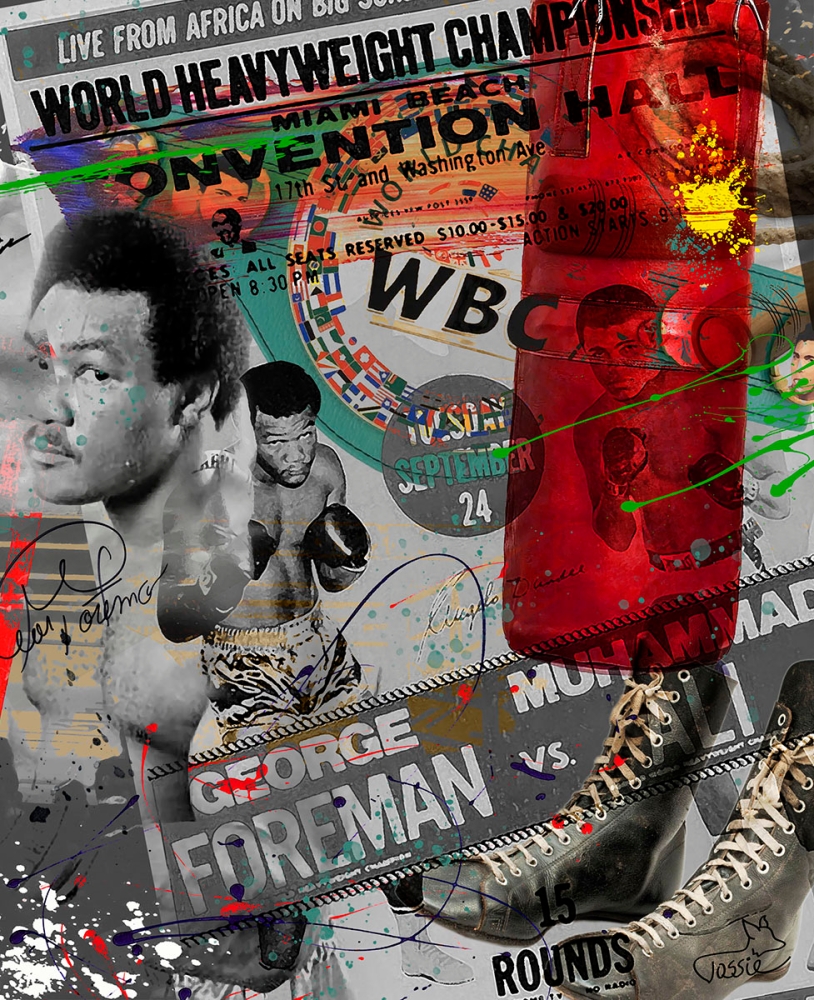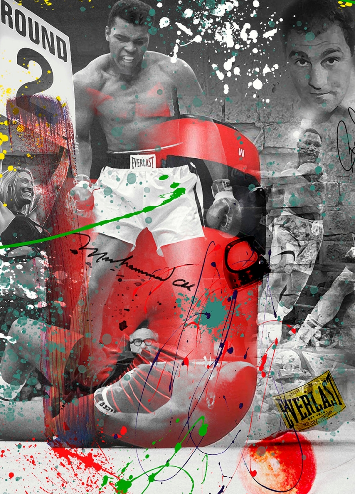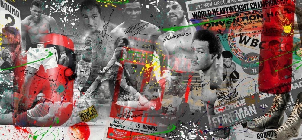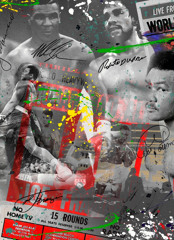 Pop art martial arts artwork. Artist: Vossie. Title: The Legends. Delivery: directly from Artist Vossie. The Legends: Muhammad Ali, Rocky Marciano, Mike Tyson, Roberto Duran, George Foreman. Dimensions: 120 cm x 56 cm, hangs 1 cm free from the wall. Material: the best quality plexiglass. Suspension system: anodized aluminum. Mounting material: included. Signed: printed. Includes: certificate. Edition: limited. Quality: gallery. Shipping: costs are borne by the buyer in consultation. Pick up: preferred. Biography. Vossie, born in Amsterdam in 1959, is a visual artist who has been active in the art world for no less than 45 years. His artistic journey was deeply influenced by the COBRA group, an influential art movement that emerged in the cities of COpenhagen, Brussels and Amsterdam and was known for its experimental approach to art. Vossie became fascinated by the avant-garde ideas of COBRA and found color its chief means and expression. His artworks radiate a vibrant and dynamic energy, inspired by the spontaneity and freedom that characterized the COBRA movement. What sets Vossie apart is his continuous collaboration with renowned artists. He sees these collaborations as opportunities to exchange ideas, spar and broaden his artistic horizons. Over the years, Vossie has built up an impressive oeuvre that is appreciated both nationally and internationally. His work continues to inspire and challenge people, and his passion for art remains undiminished.