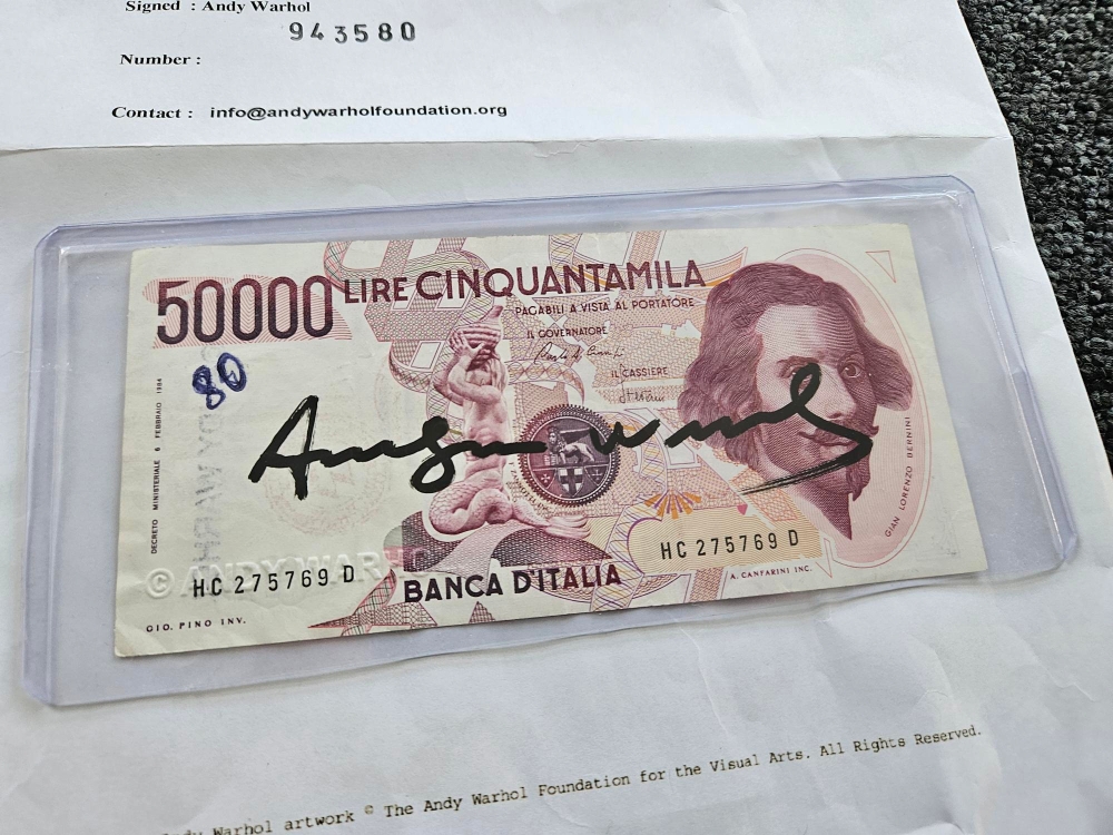 Signé à la main au stylo feutre noir par Andy Warhol sur un vrai billet de 50.000 lires, première édition 1984. Numéroté avec cachet d'usine bleu et cachet en relief © Andy Warhol. Hologramme 'vérification d'authenticité' au dos. 14,9 x 7 cm. Avec certificat de la 'The Andy Warhol Foundation for the Visual Arts'. Les billets Warhol Lira sont plus rares que les billets d'un dollar. Tous les billets étaient en circulation, comme l'artiste le voulait. Andy Warhol a passé 2 ans en Italie avec Lucio Amelio, le marchand d'art d'Andy Warhol, où les billets étaient également produits à cette époque. Info billet: recto: portrait du peintre, sculpteur et architecte italien Gian Lorenzo Bernini ; verso: statue équestre réalisée par l'artiste et vue de l'intérieur de la Basilique Saint-Pierre de Rome au Vatican.