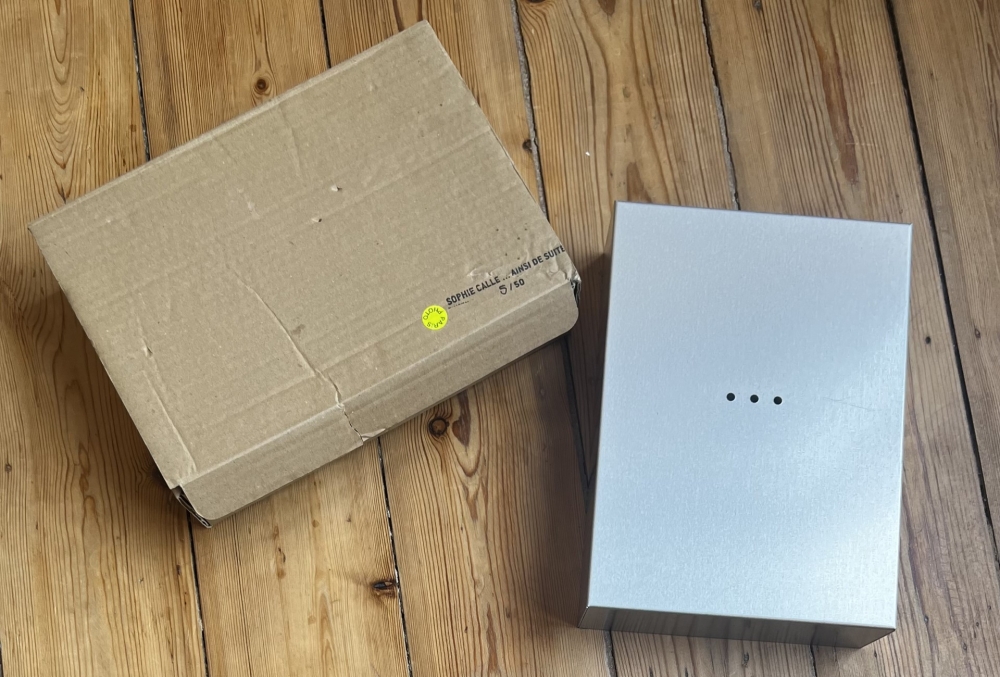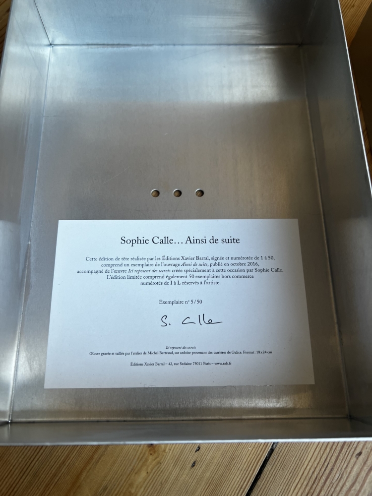 Coffret Sophie Ainsi de suite - Edition signée limitée à 50ex. contenant l'oeuvre : Ici reposent des secrets 2003 Livre-objet de collection - Boite de rangement avec pastille Paris-Photo - numéro 5/50 Coffre métallique perforé de 3 points de suspension, signé à l'intérieur par Sophie Calle à l'encre. Beau livre imprimé sur plusieurs papiers, avec pages perforées, pages de différents formats et inserts. À l'occasion de la sortie de l'ouvrage Ainsi de suite de Sophie Calle, nous proposons une édition limitée à 50 exemplaires comprenant l'ouvrage éponyme et luvre Ici reposent des secrets créée spécialement à cette occasion par Sophie Calle. Cette édition de tête, sous coffret métallique, est signée et numérotée par l'artiste. Entre catalogue raisonné et livre dartiste, Ainsi de suite rassemble le travail de Sophie Calle depuis 2003 jusquà aujourdhui en reprenant les choses là où elles avaient été laissées par Mas-tu vue, premier ouvrage rétrospectif des uvres de lartiste réalisées entre 1979 et 2003, qui se terminait sur Unfinished. Ainsi de suite débute par cette série et poursuit jusquaux travaux en cours, en présentant à la fois les uvres et des vues dexposition pour beaucoup inédites. Edition limitée sour coffret, comprenant l'ouvrage Ainsi de suite, et luvre Ici reposent des secrets, gravée et taillée par latelier de Michel Bertrand, sur ardoise provenant des carrières de Galice. signé et numéroté à 50 exemplaires. Format : 18 x 24 cm Très bon état. A noter une déchirure sur le rabat du carton de rangement. Métal avec légères rayures.
