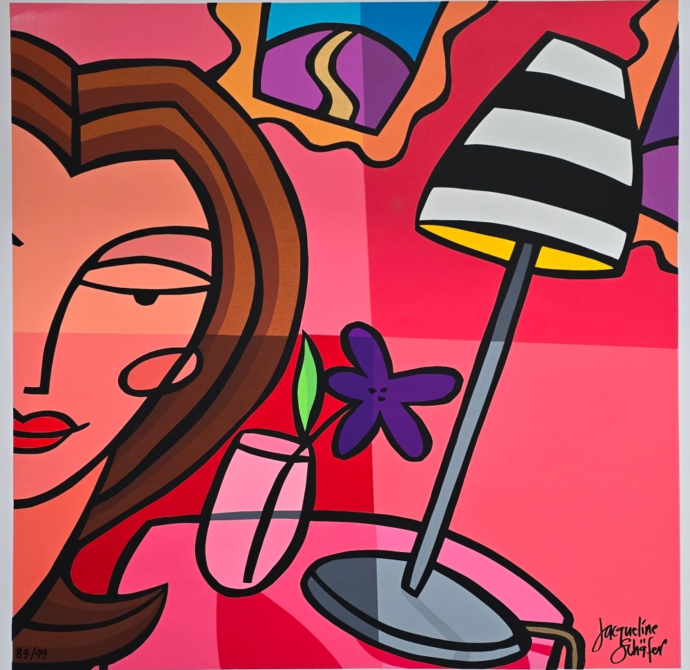 Handgesigneerde zeefdruk van Jacqueline Schafer Afmeting blad: 80 x 80 Oplage: 99 ex. Het oplagenummer op de foto kan afwijken van het verkochte. Als wij meerdere exemplaren hebben in gelijke conditie maken wij niet voor elk blad een nieuwe foto. Wordt zeer zorgvuldig verpakt en aangetekend/verzekerd verzonden!