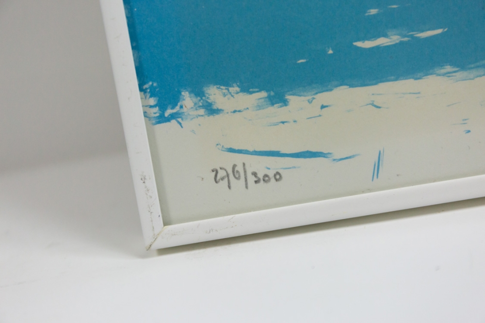 Litho a une légère décoloration ou jaunissement, visible à travers les bords moins décolorés. Est encadré mais le cadre a quelques défauts et pourrait être préférable de le remplacer.