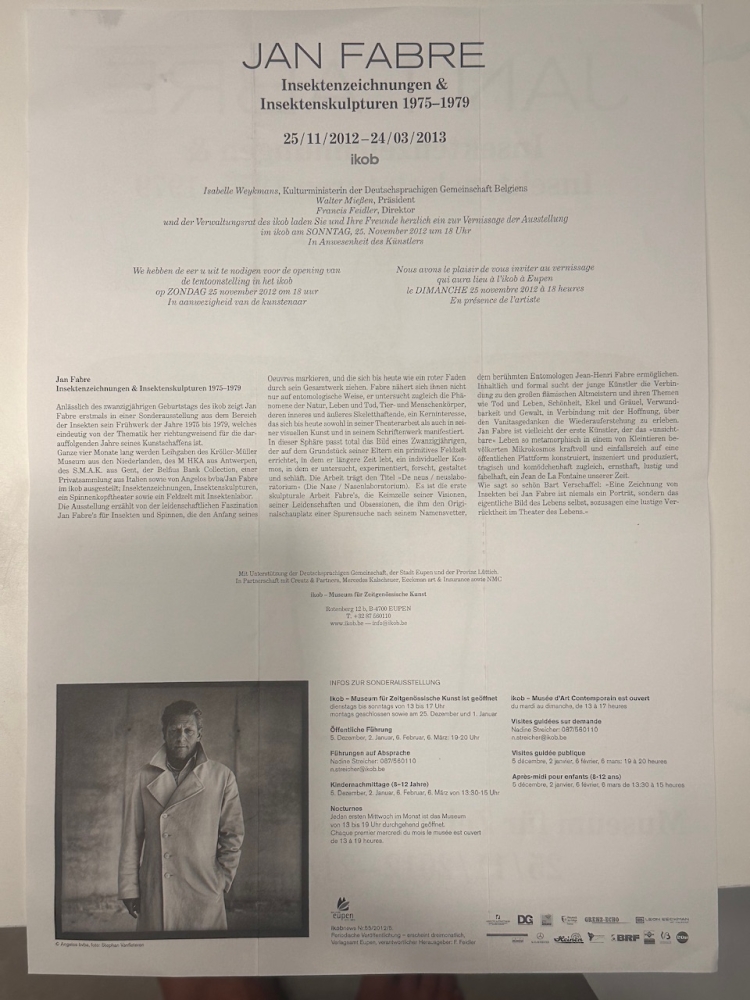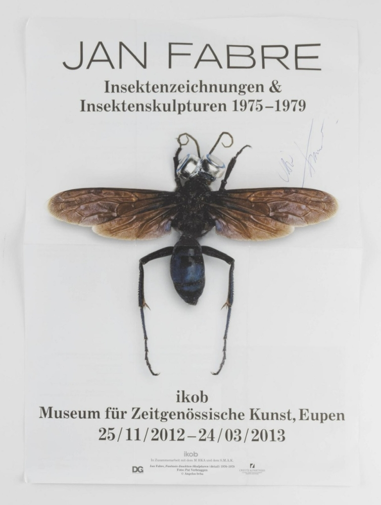 Gesigneerde affiche van Jan Fabre. Dubbelzijdig gedrukt. Werd geplooid verzonden bij uitgave. Zeldzame affiche. Jan Fabre is een Belgisch multidisciplinair kunstenaar. Zijn artistieke opleiding genoot hij aan het Stedelijk Instituut voor Sierkunsten en Ambachten en aan de Koninklijke Academie voor Schone Kunsten van Antwerpen