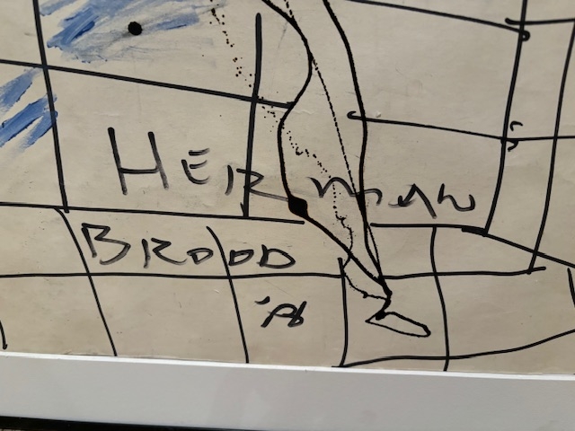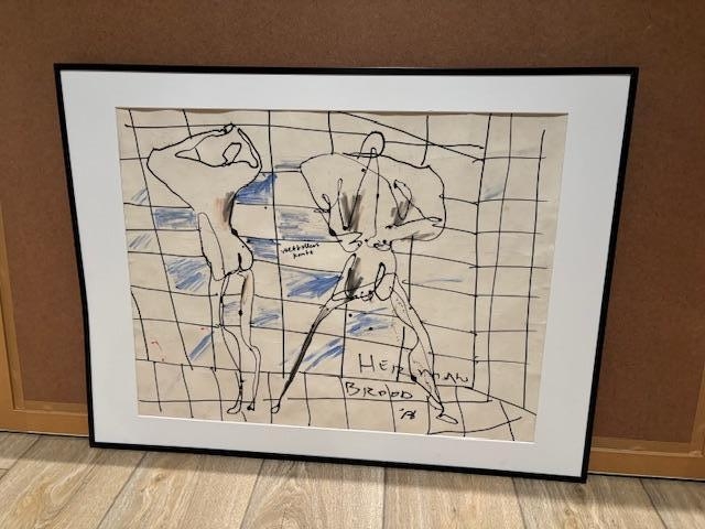 Het betreft hier een unieke originele tekening van Herman Brood uit 1986, genaamd voetballers konte. Gemengde techniek in acryl, stift en inkt. In passe partout en ingelijst in zwarte kader (zonder glas).