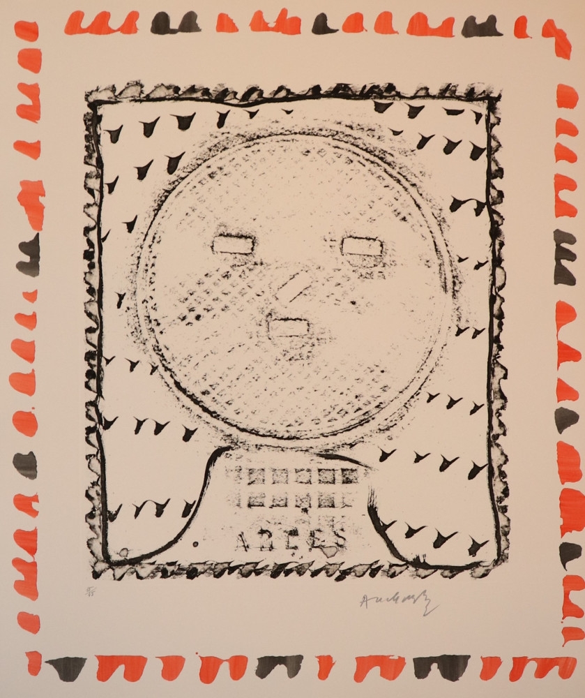 Originele en unieke ets met pochoir van waterverf errond, getekend en genummerd 45/45. Hier is de introductie van riool- en putdeksels merkbaar in zijn werk. Alechinsky maakte een 'doordruk' van een putdeksel (zoals we als kind een muntstuk op papier doordrukten met een potlood), waarrond hij verder speelt en improviseert in zijn grafische en originele werken. De pochoir of omkadering in waterverf maakt het werk extra interessant en hierdoor kunnen we spreken van een gemengde techniek. Pierre Alechinsky is een Belgische kunstenaar die in 1949 lid werd van de Cobra groep (CoBrA= Copenhagen Brussel Amsterdam) en hij was een belangrijke vertegenwoordiger van Cobra. Hij is trouwens nog de enige in leven zijnde Cobra kunstenaar. Zijn werk bevindt zich in de collectie van de grote musea voor moderne kunst in de hele wereld.
