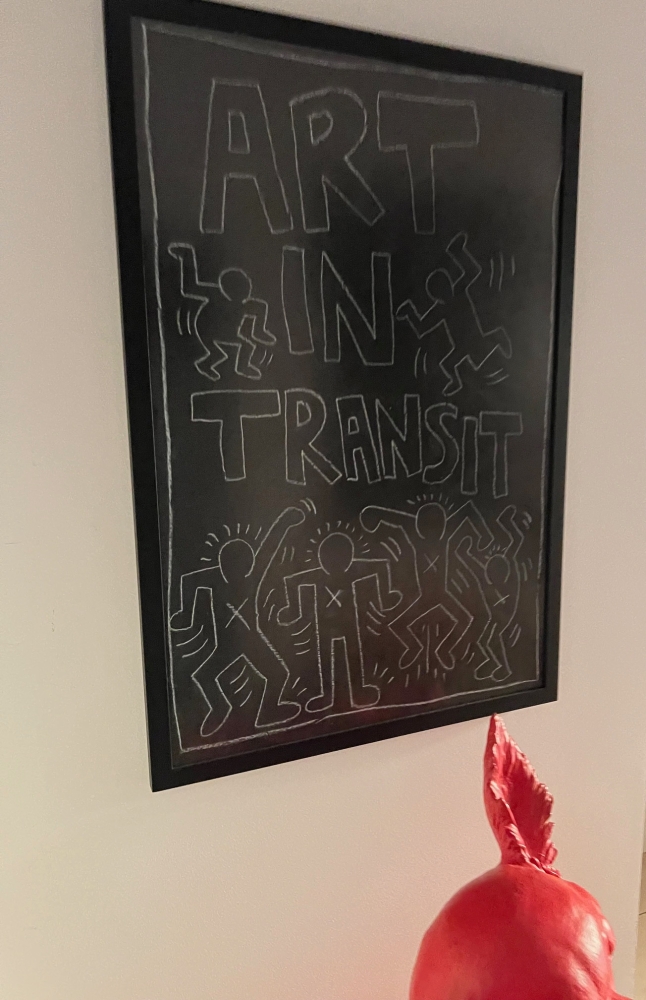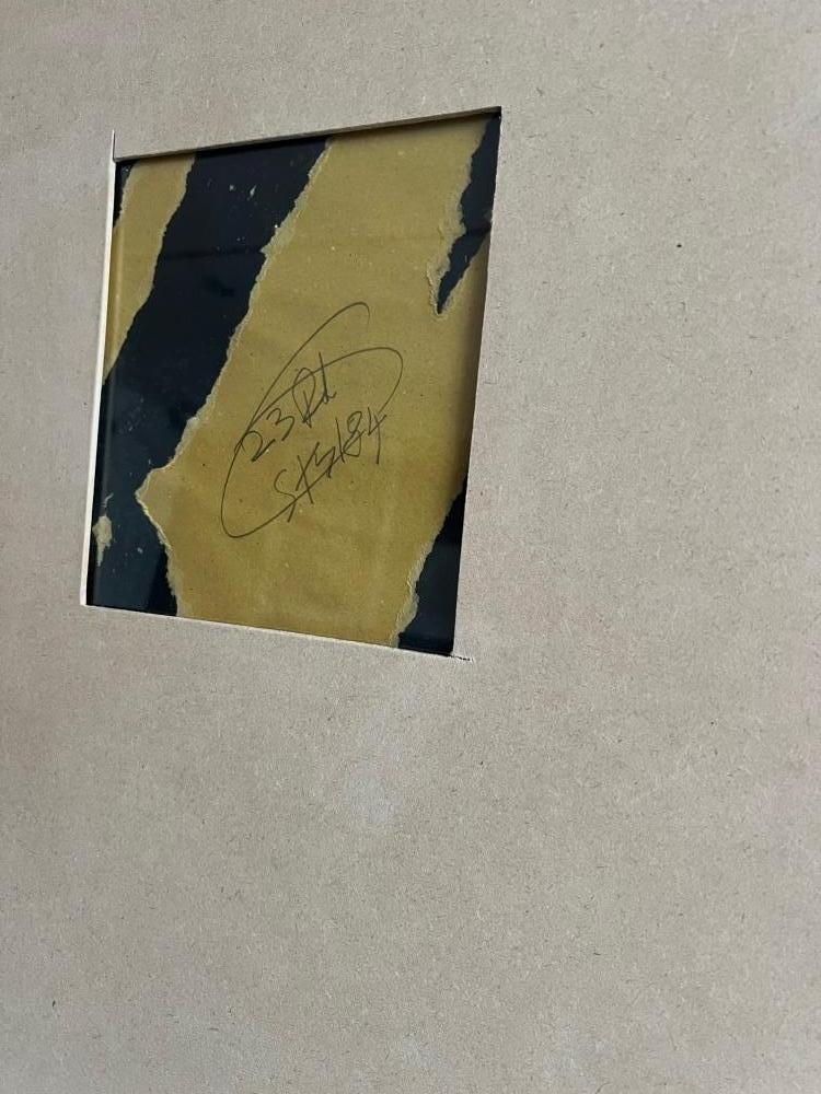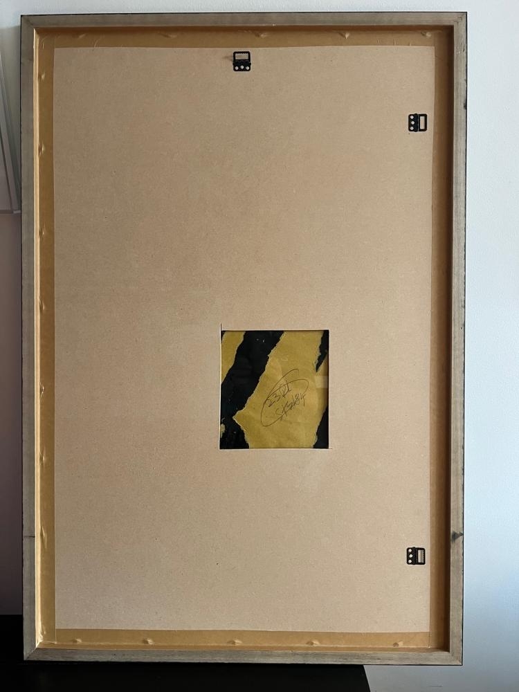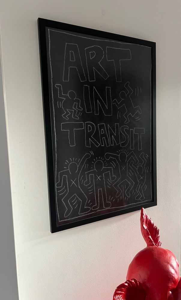 NY SUBWAY DRAWING ART IN TRANSIT originele kalktekening op zwart mat papier. Zichtbare kreuken en deuken aan de voorzijde, op de achterzijde restanten van een billboard en opschrift ( 23rd street/ 84) Werk is professioneel ingelijst met ontspiegeld glas (uitstekende staat). Eind 1980 merkte Haring op dat de lege advertentieruimtes van de New York City-metro bedekt waren met mat zwart papier toen de advertentie-abonnementen afliepen. Hij kocht meteen wat krijt en begon te tekenen. In de daaropvolgende vijf jaar werd dit een dagelijkse, repetitieve obsessie. Haring tekende in een periode van vijf jaar, van 1980 tot 1985, meer dan 5.000 krijttekeningen in metrostations in New York City. zijn metro tekeningen behoren tot zijn bekendste en meest gevierde werk. Van het grote aantal gemaakte tekeningen in de subway werden er enkele gepubliceerd in een boek art in transit en 31 subway drawings. Volgens de Keith Haring Foundation was deze street art, gemaakt door de kunstenaar, niet bedoeld om later verkocht te worden. Merk op dat de Keith Haring Foundation al vele jaren geen certificaat van echtheid (COA) uitschrijft. Werken van Keith Haring, die niet kunnen gevonden worden in één van de catalogi van Haring, worden daarom bij ArtAuction.online steeds als "after" of "naar" gemarkeerd omdat we deze niet kunnen attesteren.