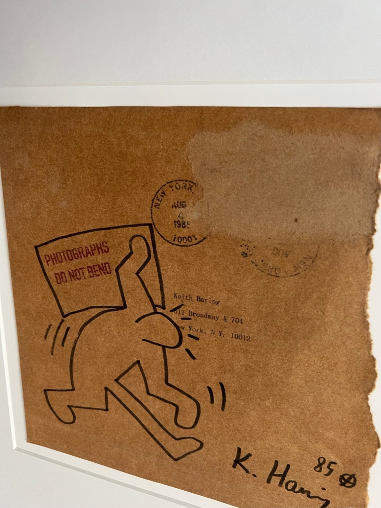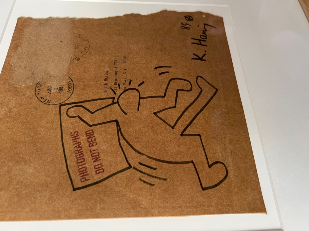 Tekening in stift op bruine enveloppe, poststempel New York 5 augustus 1985, geadresseerde Keith haring studio, professioneel ingelijst houten kader met ontspiegeld museumglas. Keith Haring was een Amerikaans kunstenaar. De kunst die Keith Haring maakte wordt soms popart genoemd, maar ook de termen graffiti-art en moderne kunst worden gebruikt. Zijn cartoonachtige schilderingen en tekeningen gingen onder andere over aids, drugs en apartheid. Merk op dat de Keith Haring Foundation al vele jaren geen certificaat van echtheid (COA) uitschrijft. Werken van Keith Haring, die niet kunnen gevonden worden in één van de catalogi van Haring, worden daarom bij ArtAuction.online steeds als "after" of "naar" gemarkeerd omdat we deze niet kunnen attesteren.