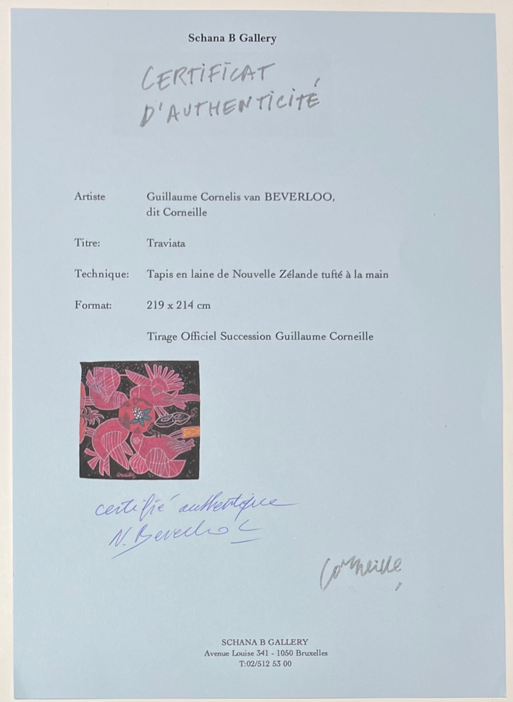 Tapis La Traviata Tapis en laine de Nouvelle-Zélande, semi-mécanique, tufté à la main. Dimensions : 219 x 214 cm (les dimensions peuvent varier de quelques cm par tapis). Délivré avec un certificat d'autentiticité. Guillaume Corneille, artiste invité du Festival de musique classique de Salzbourg, a peint un oiseau rond pour célébrer La traviata. Collecte possible à Bruxelles.