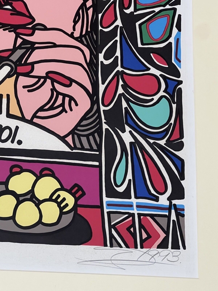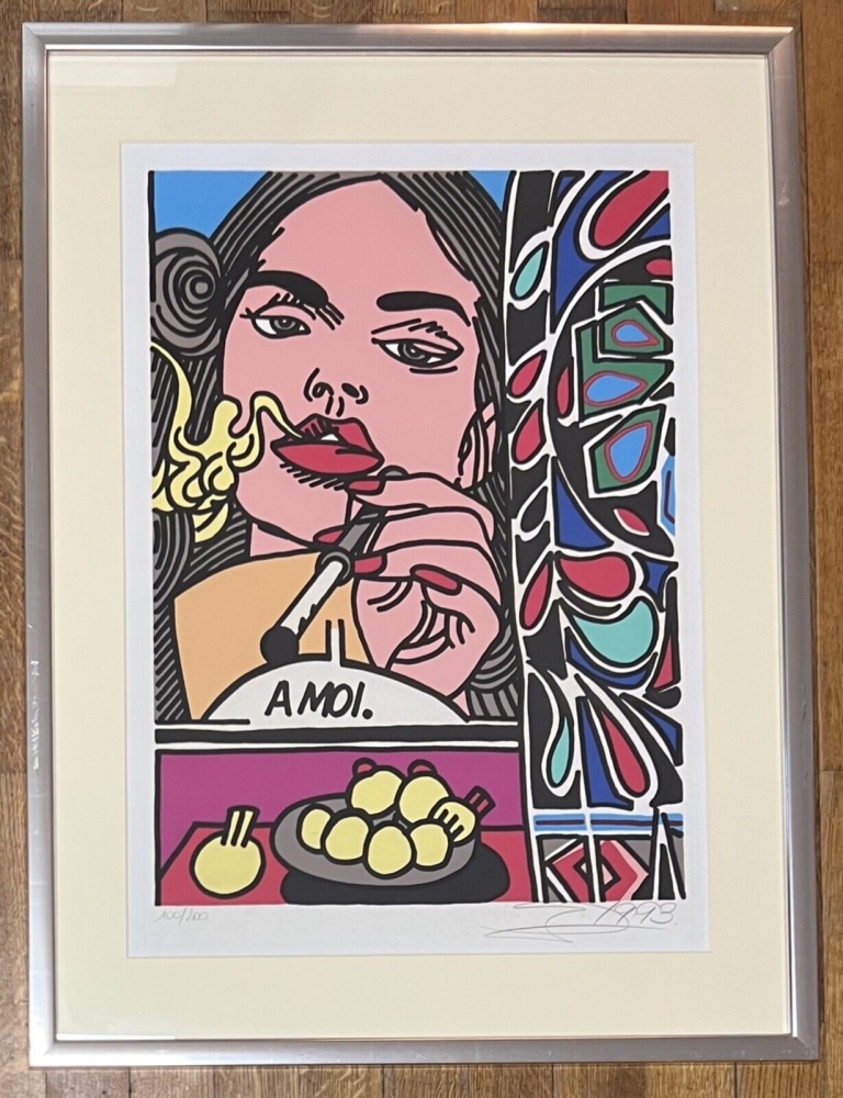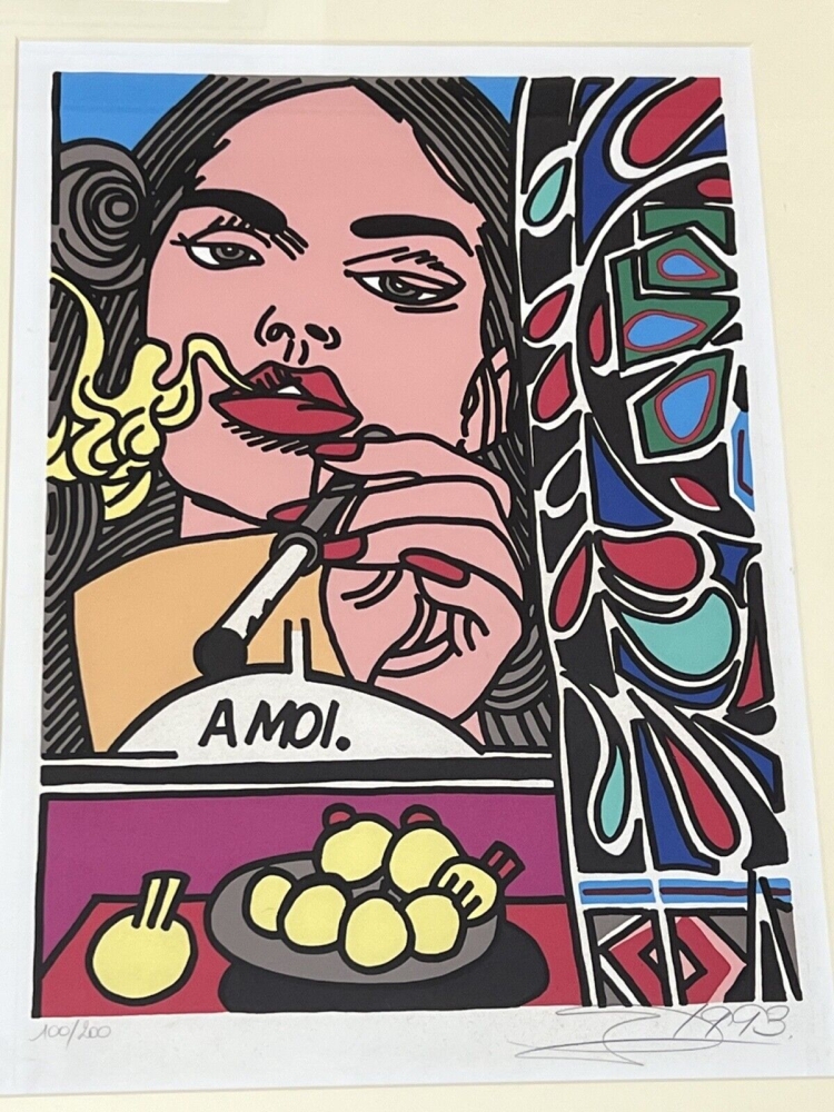 Belle sérigraphie signée. Dimensions avec cadre : 80 x 60 Dimensions à l'intérieur du passe-partout : 62 x 44 cm Possibilité d'un envoi sans le cadre Guðmundur Guðmundsson, dit Erró, est un peintre et graveur islandais, né le 19 juillet 1932 à Ólafsvík. Il est le cofondateur du mouvement pictural de la figuration narrative en France.