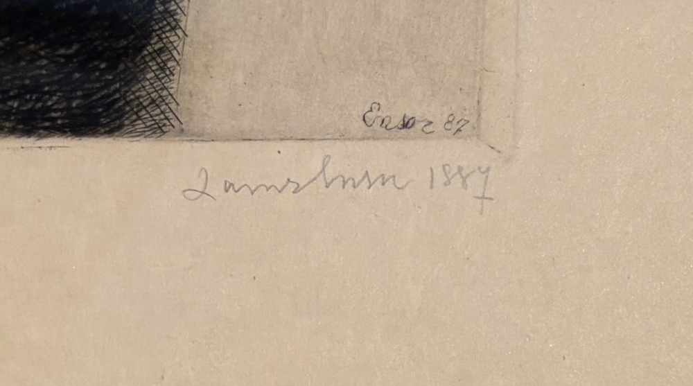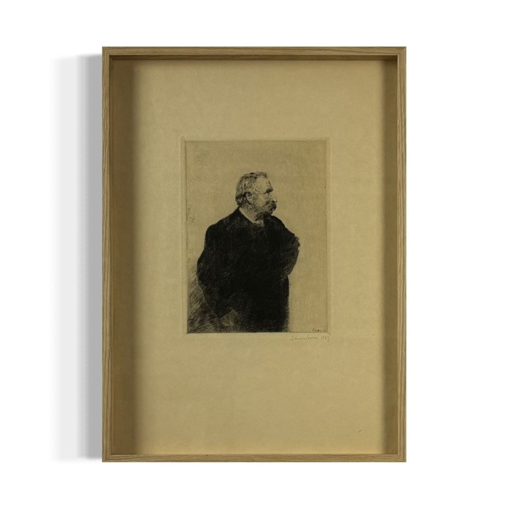 Gravure signée de James Ensor intitulée 'Portrait de Ernest Rousseau' de 1887. Signé à la main et daté au crayon par l'artiste. Eau-forte sur papier. Encadré professionnellement. Expédition et retrait assurés possibles.