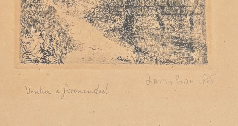 Gravure originale de 1888 de l'artiste belge James Ensor intitulée 'Sentier à Groenendael'. Signé, daté et titré par l'artiste au crayon. Professionnellement encadré dans un cadre en chêne. Expédition et retrait assurés possibles.