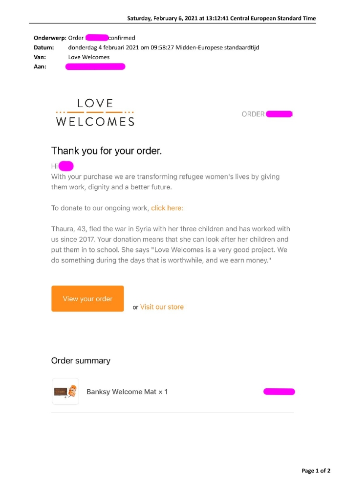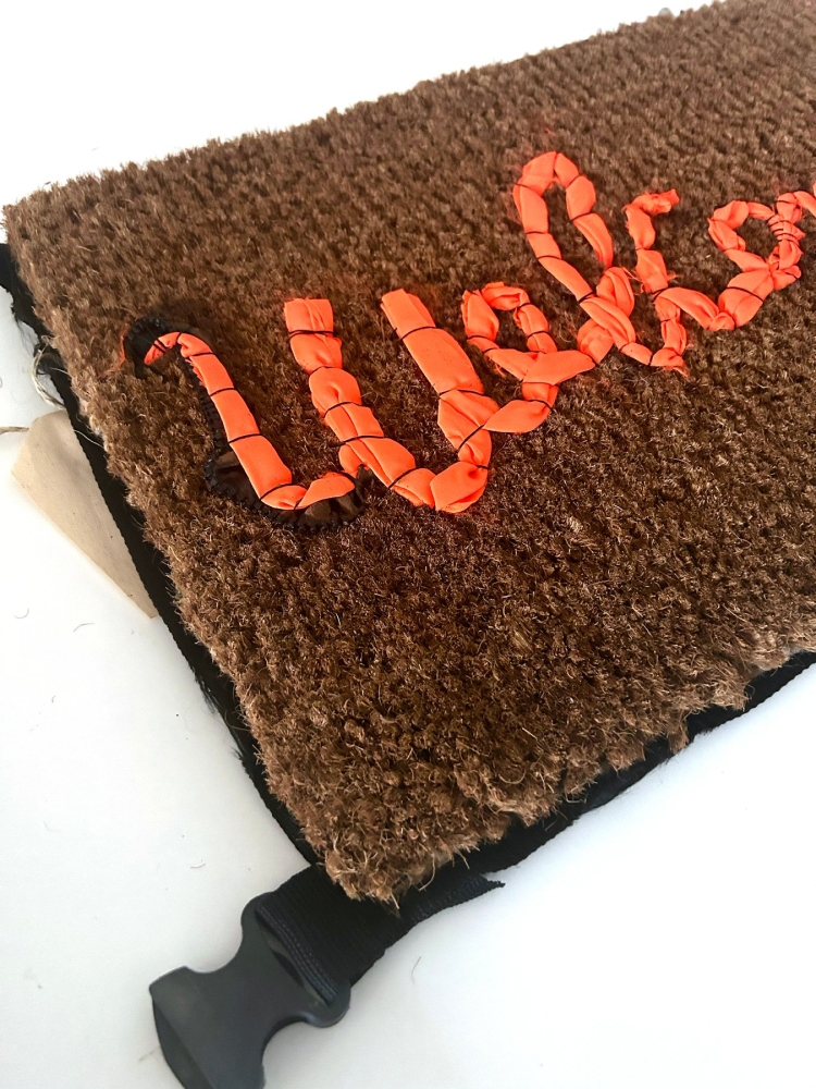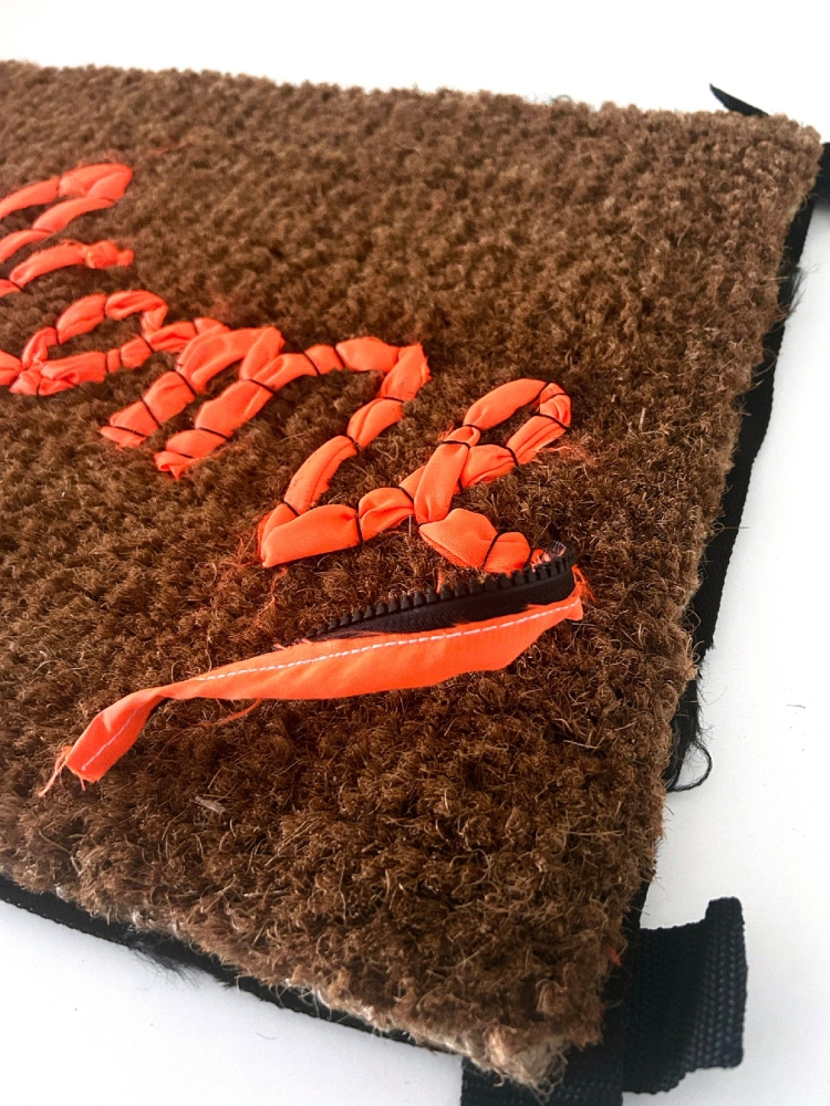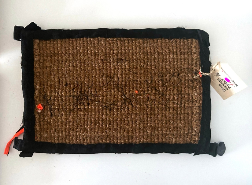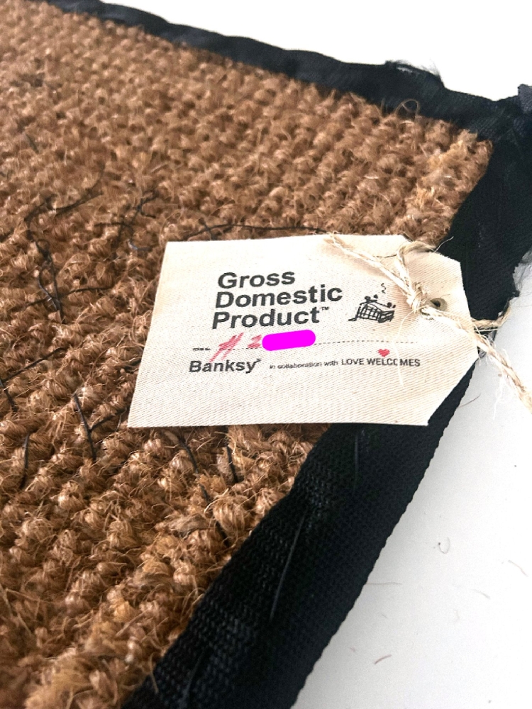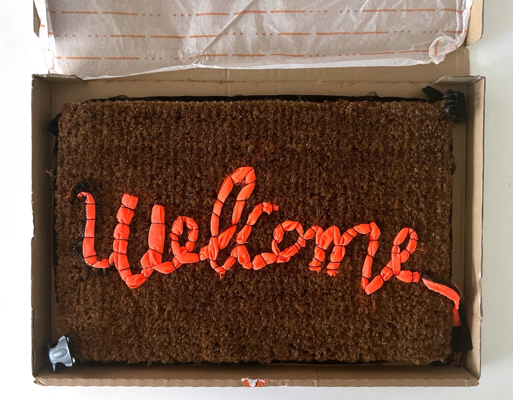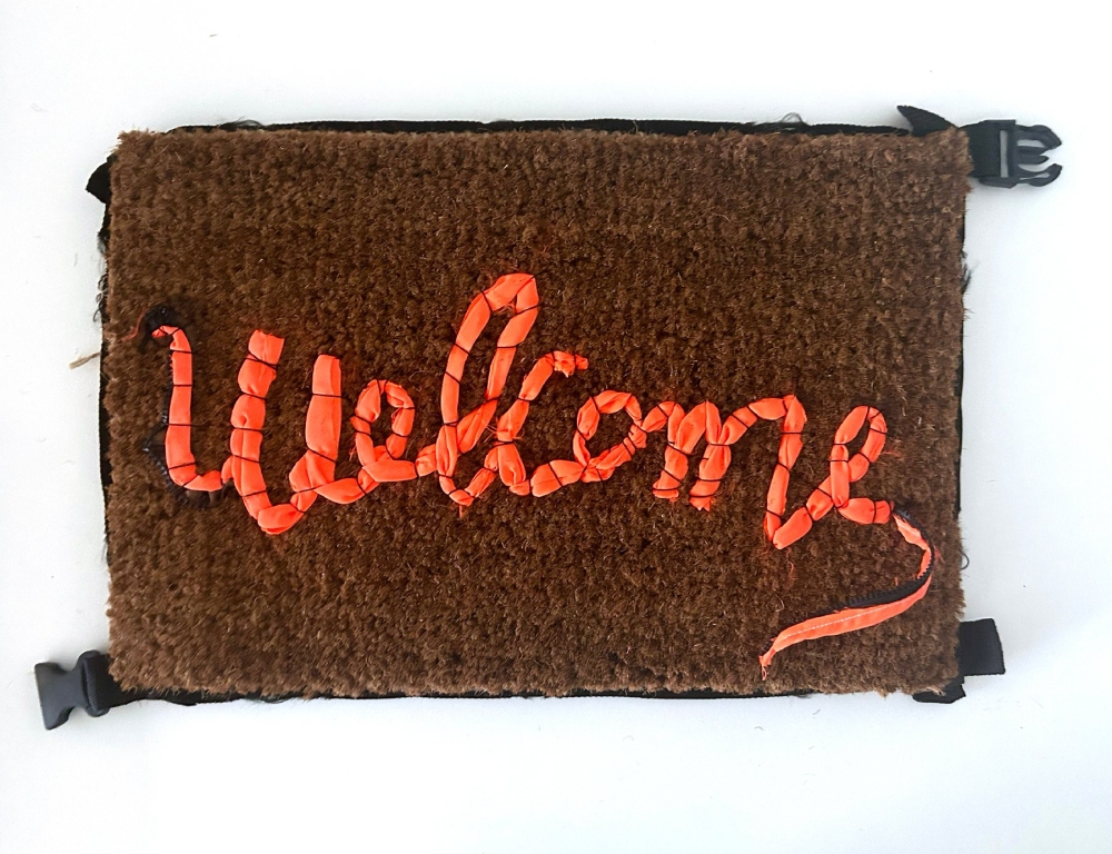 - Life vest fabric on fiber doormat - 60 cm X 40 cm - From the batch between the numbers 2000 and 2500 - Produced by Gross Domestic Product and Love Welcomes, London - Condition: Comes in original box with tag. No apparent, non inherent condition issues (see pictures). - Be aware this product is handmade, small defects are part of the artwork. Artwork comes as is. - First owner. Copy of invoice will be added - Will be sent carefully packed and with full insurance This work is from the edition produced in collaboration with Love Welcomes, an organization that works with and supports refugee women in detainment camps in Greece. This mat was hand-stitched using the fabric from life vests abandoned on the beaches of the Mediterranean.