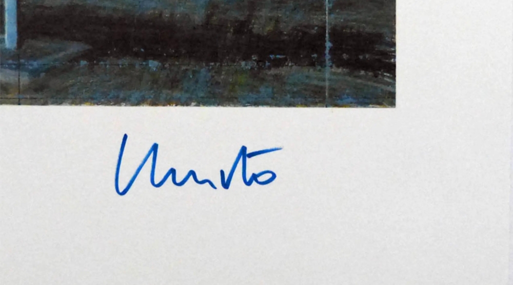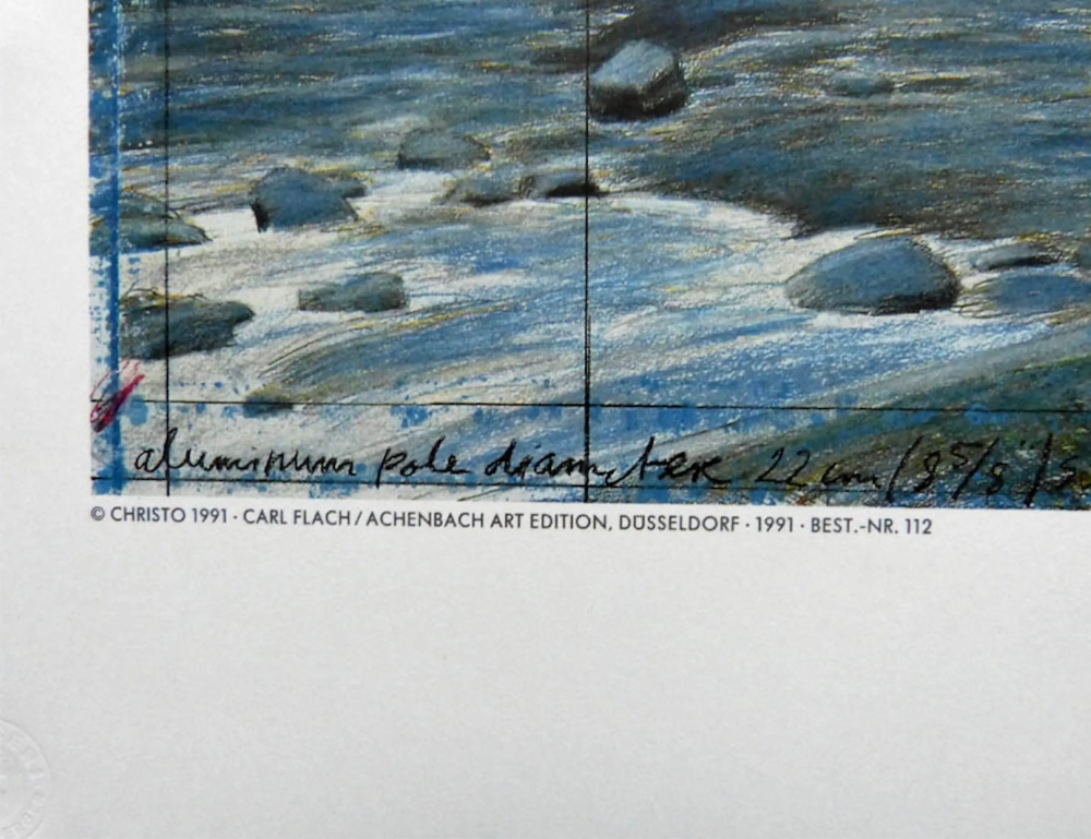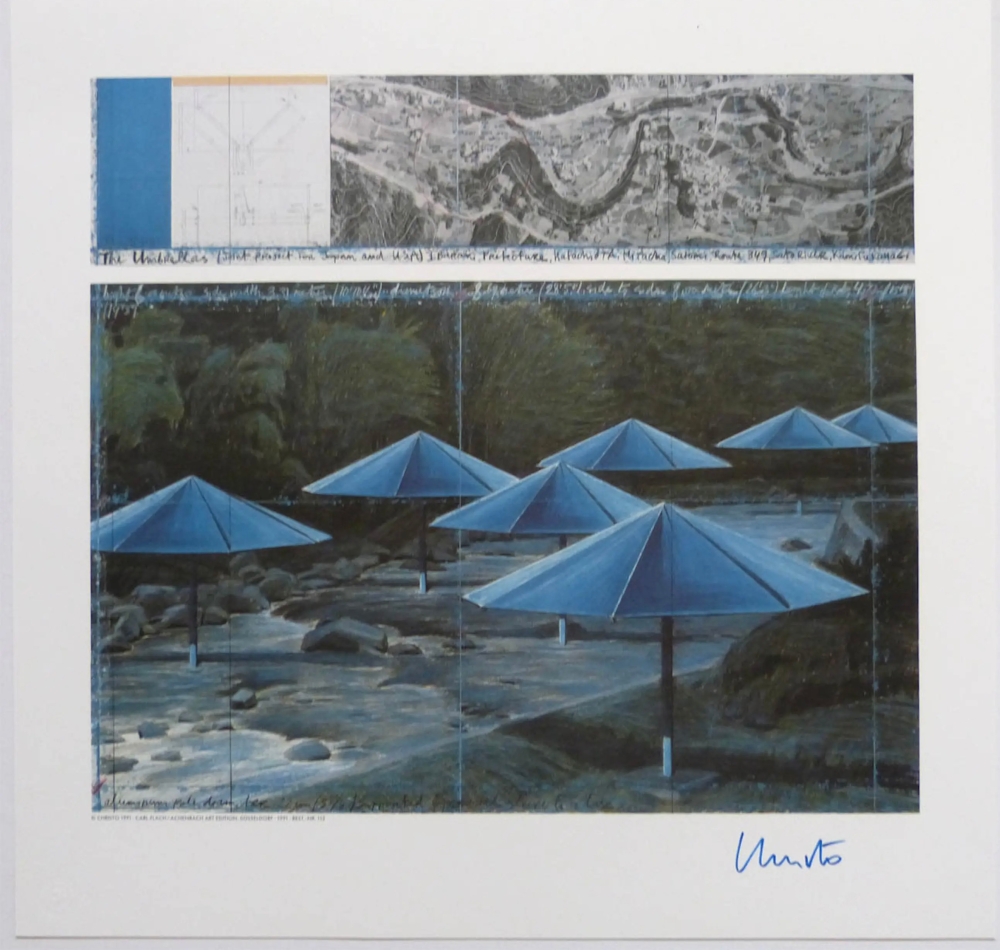 Christo Projet : 1984 - 1991 Lieu : Ibaraki, Japon "Les parapluies bleus du Japon" Signé en bas à droite impression offset sur un beau papier épais Achenbach Édition d'Art 1991 Timbre sec : Lithoseri Domberger