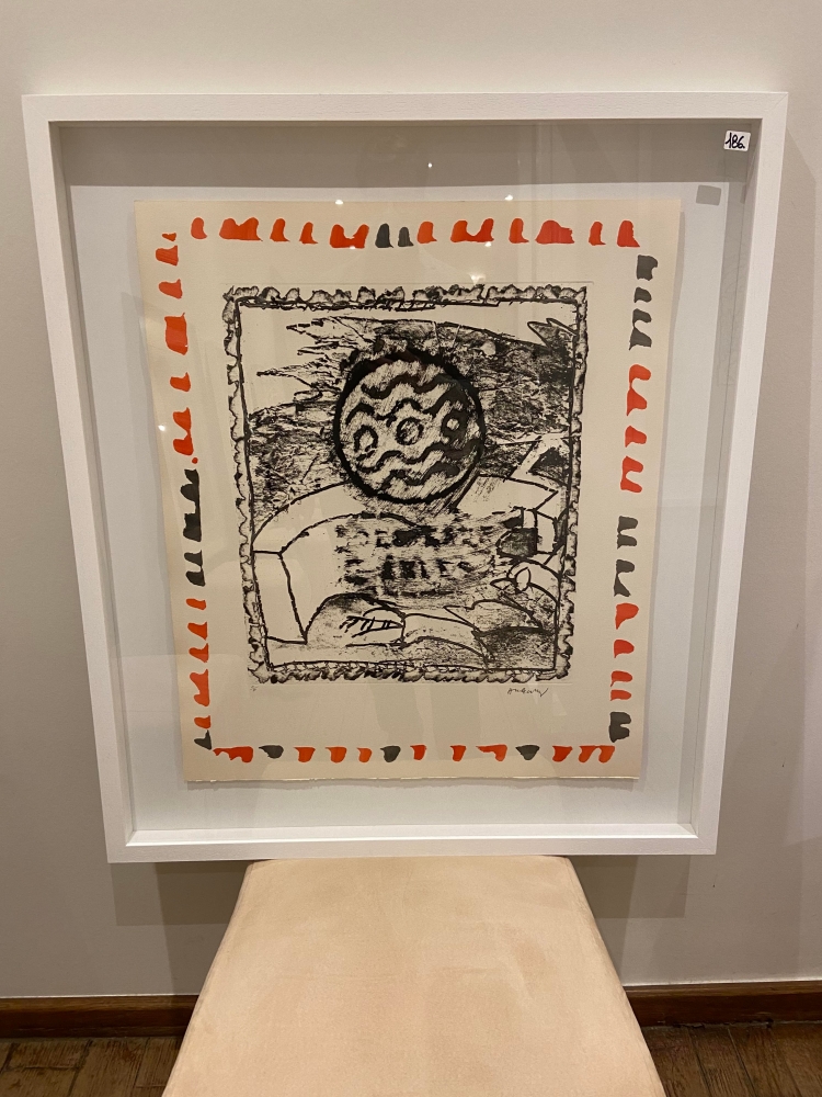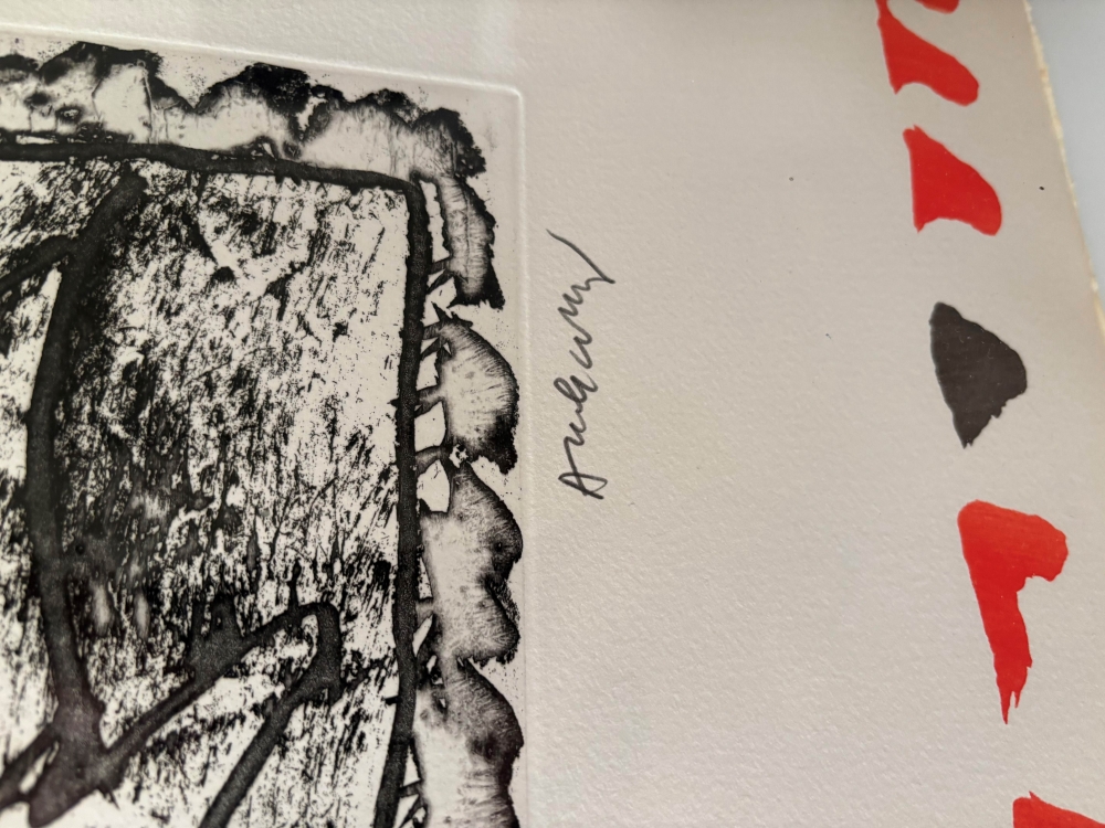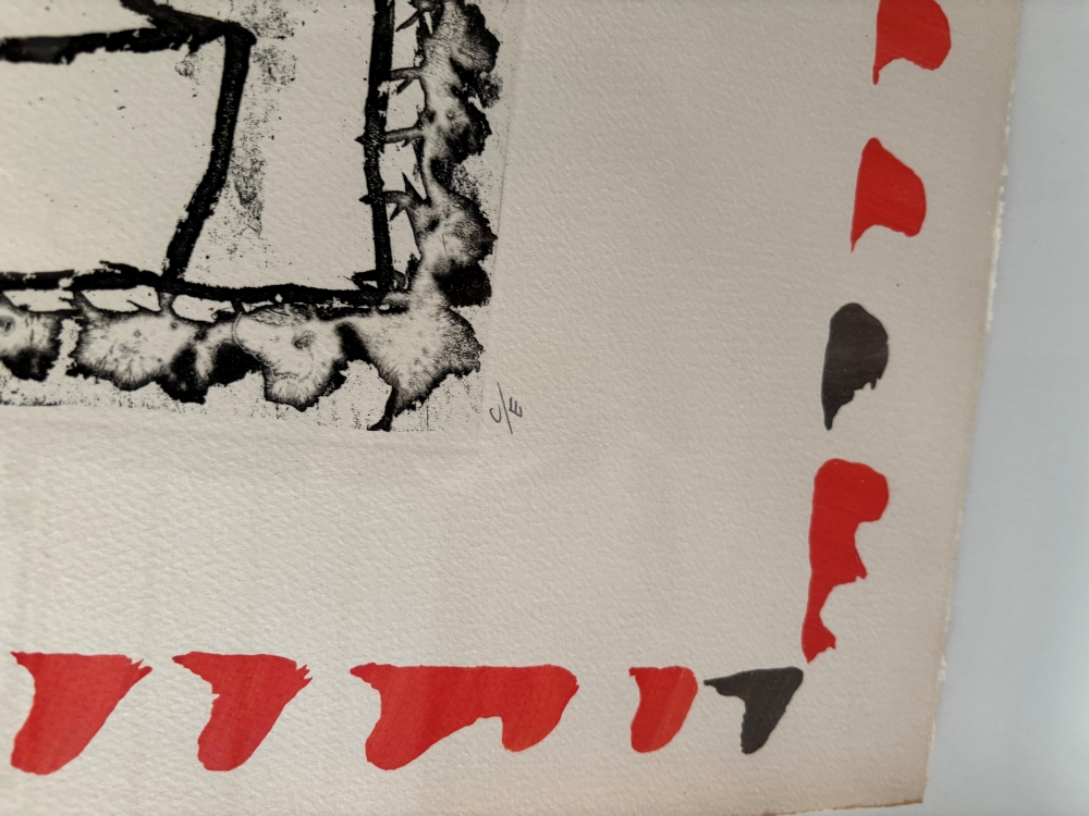 Originele en unieke ets met pochoir van waterverf errond, getekend en genummerd C/E. Hier is de introductie van riool- en putdeksels merkbaar in zijn werk. Alechinsky maakte een 'doordruk' van een putdeksel (zoals we als kind een muntstuk op papier doordrukten met een potlood), waarrond hij verder speelt en improviseert in zijn grafische en originele werken. De pochoir of omkadering in waterverf maakt het werk extra interessant en hierdoor kunnen we spreken van een gemengde techniek. Het werk is fraai ingelijst met passe-partout. Pierre Alechinsky is een Belgische kunstenaar die in 1949 lid werd van de Cobra groep (CoBrA= Copenhagen Brussel Amsterdam) en hij was een belangrijke vertegenwoordiger van Cobra. Hij is trouwens nog de enige in leven zijnde Cobra kunstenaar. Zijn werk bevindt zich in de collectie van de grote musea voor moderne kunst in de hele wereld.