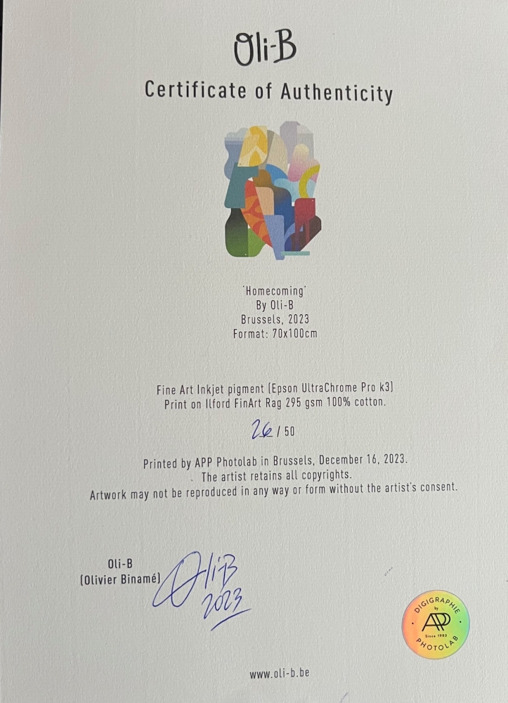 Digigraphie par Oli-B 70x100cm Edition de 50 exemplaires, signés et numérotés Fine Art Inkjet pigment (Epson UltraChrome Pro k3) Tirage par APP Photolab Bruxelles sur Hahnemühle Ultra Smooth 305 g/m² 100% coton. Condition parfaite. Y compris le certificat. (le numéro de l'uvre proposée peut différer de la description)