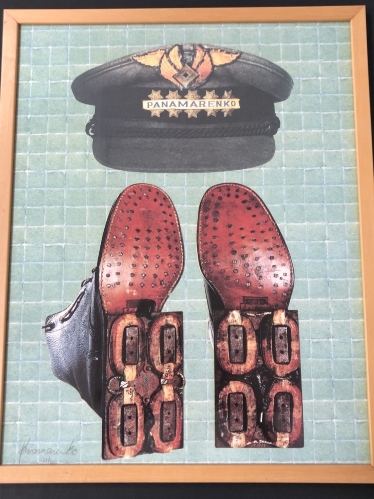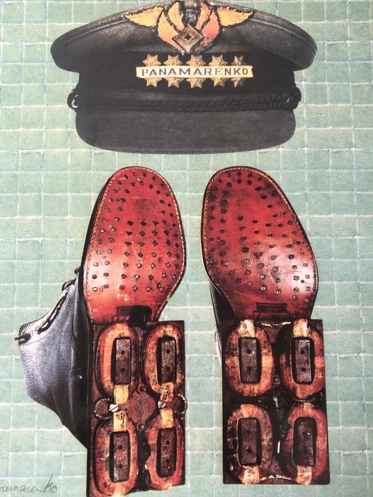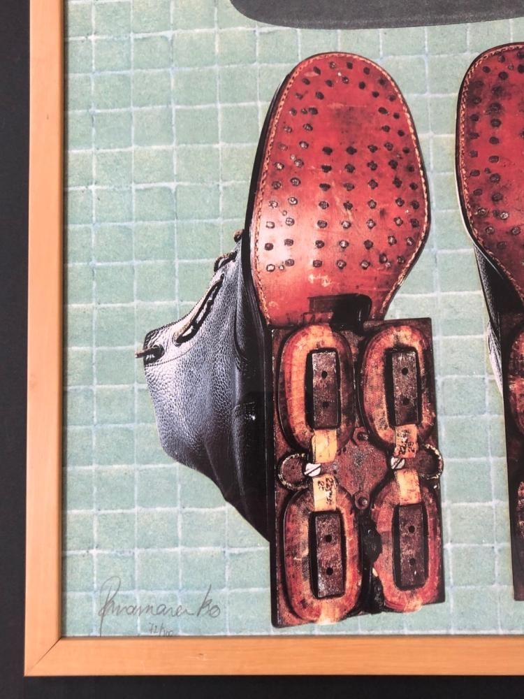 Zeer fraaie Kleurendruk met diepdruk. Het werk is een collage waarbij bepaalde stukken er door Panamarenko zijn opgekleefd. Gesigneerd en genummerd op 100 exemplaren. De magnetische schoenen vormen een sleutelwerk van Panamarenko, ze dateren al van Panamarenko's beginperiode (1967). De schoenen, volgens Panamarenko militaire bottines, komen uit zijn moeders schoenwinkel Goliatje in Antwerpen.