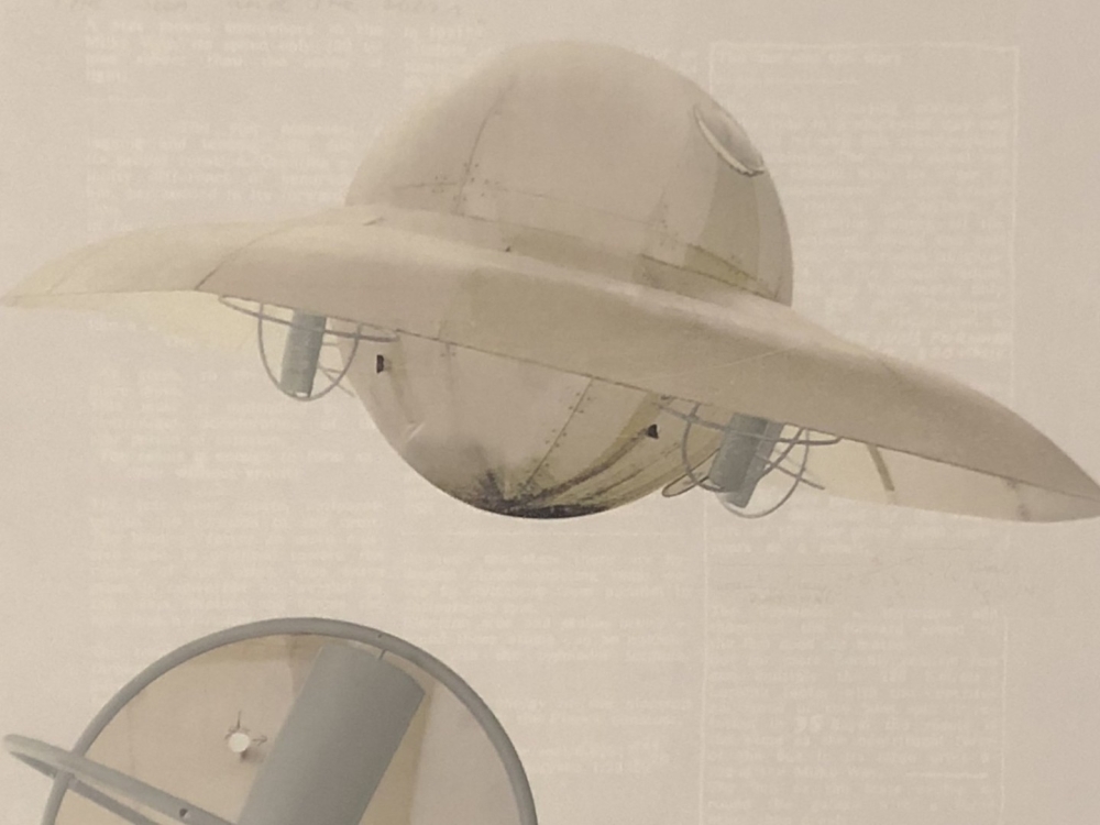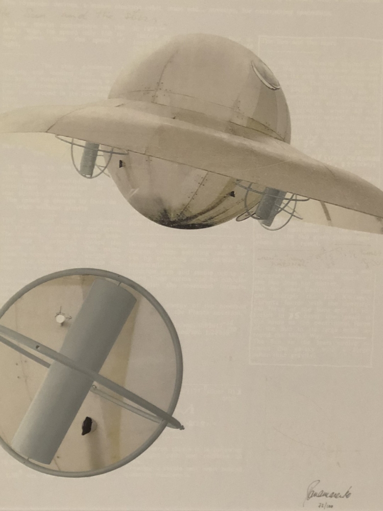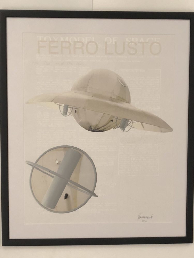 Lithographie de Panamarenko intitulée Ferro Lusto = le vaisseau mère que Panamarenko a inventé dans le cadre de sa théorie du voyage intergalactique et qui servirait de base à de plus petites « soucoupes volantes » qu'il appela « Bings ». L'uvre montre la fascination de Panamarenko pour le cosmos, la gravité, le mouvement et la recherche de moyens de voler, brouillant les frontières entre la science, la technologie et l'art. Cette édition a été publiée par Ronny Van de Velde à l'occasion des 30 ans de carrière de Panamarenko, de 1968 à 1998. Décrit comme multiple no. 77-12 (en multiples partie II éd. Gal. J Jamar). Impression en couleurs avec impression taille-douce en relief. Signé à la main et numéroté à la pointe d'argent en bas à droite. Cadre en bois à montage professionnel avec passe-partout et verre d'art. Préférence pour l'enlèvement à Gand sur rendez-vous.