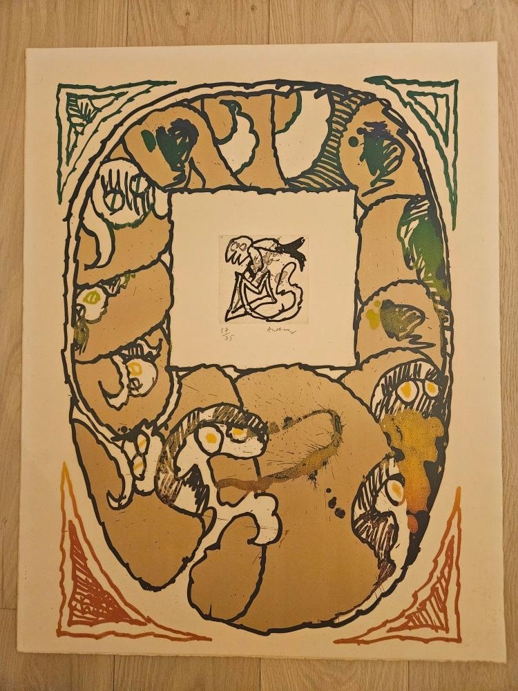 Pierre Alechinsky 'Coup De Pattes' Gesigneerd met de hand in potlood Genummerd in potlood, editie op 75 ex (het anageboden nummer is 57) Mixed Media: Kleurenlithografie + ets Jaartal: 1980 Afmetingen: 80 x 63 cm Met certificaat