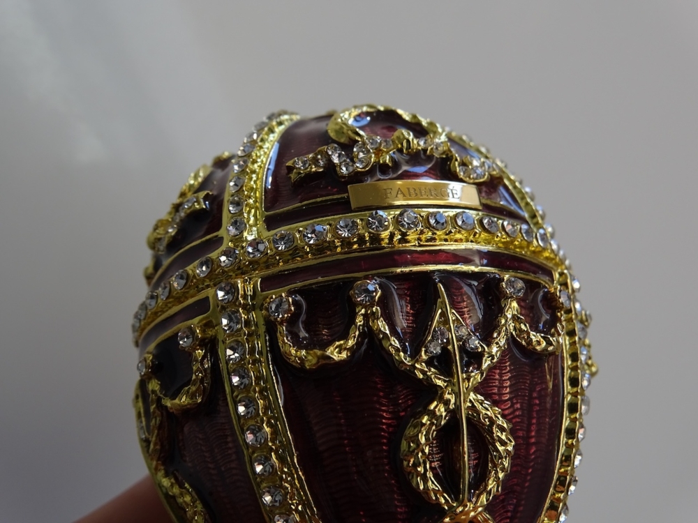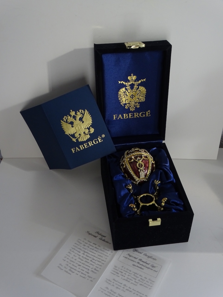 Maison de Fabergé - Oeuf Impérial - Pendentif à l'intérieur, entièrement poinçonné, Certificat d'authenticité inclus - Émail Oeuf impérial de la maison Fabergé avec COA - Certificat d'authenticité - Finition or 24 carats - Émail Il s'agit d'une édition limitée, très rare à trouver émail avec une finition plaqué or 24 carats et plus de 200 strass autrichiens d'une très belle brillance. Dimensions de l'uf et de la base environ 9 cm, uf environ 7 cm La famille Fabergé est originaire de France mais a été forcée de quitter le pays en raison de persécutions religieuses. Au XVIIIe siècle, la famille s'installe en Russie. Peter Carl Fabergé est né le 30 mai 1846, fils d'un orfèvre. Après avoir fait son apprentissage auprès de plusieurs maîtres orfèvres en Allemagne, en France et en Angleterre, Peter Carl Fabergé est revenu à Saint-Pétersbourg en artisan hautement accompli. En 1885, Peter Carl Fabergé a présenté le premier uf impérial au tsar Alexandre III et est rapidement devenu le joaillier le plus célèbre au monde. Investir dans Fabergé est une aussi bonne idée que les investissements en lingots d'or ou même l'investissement dans l'art de grands artistes tels que Warhol, Chillida, Roy Lichtenstein Basquiat ou Banksy.