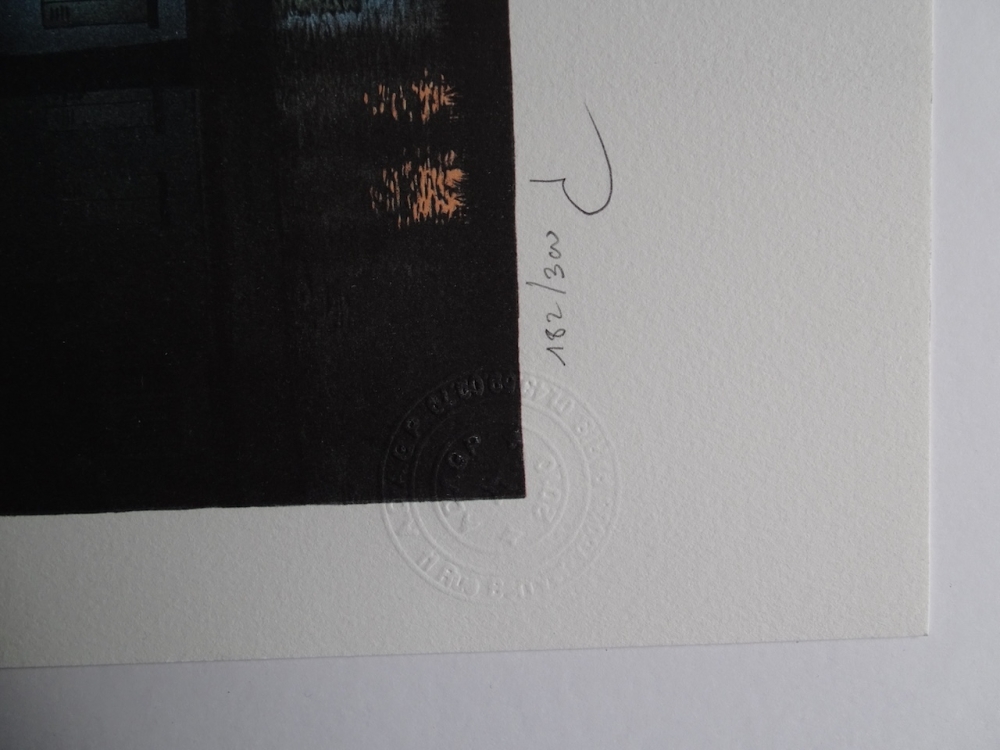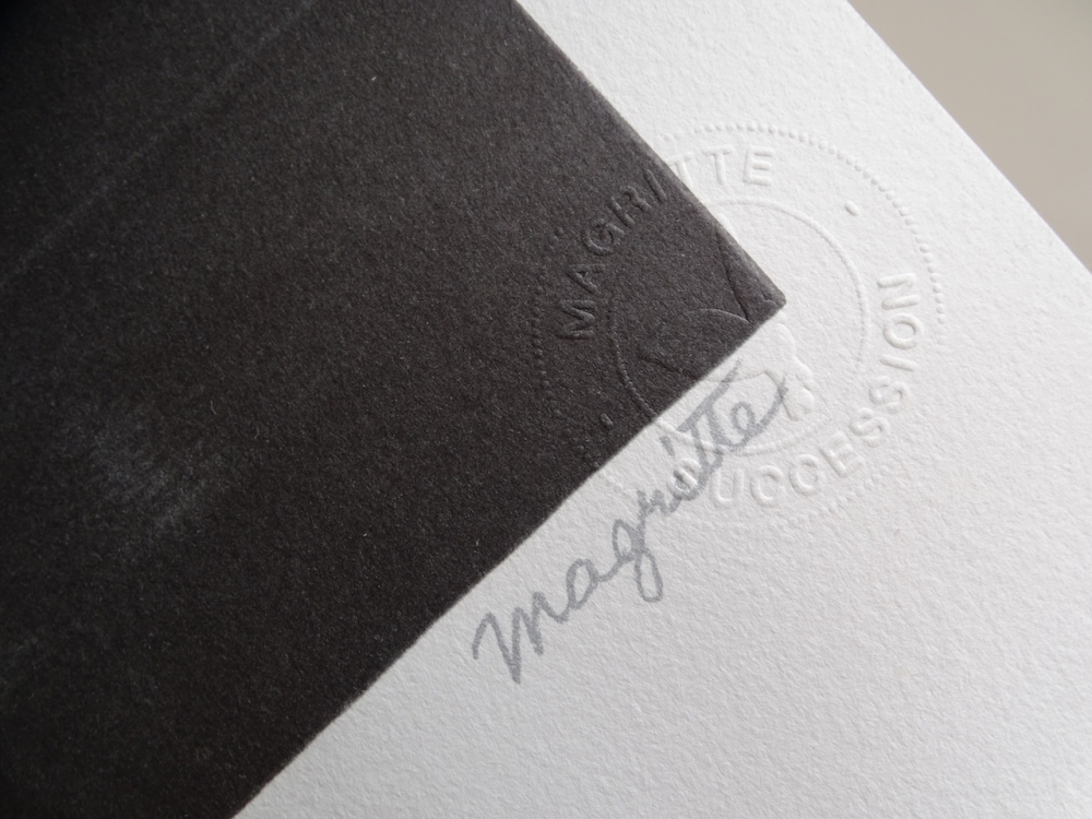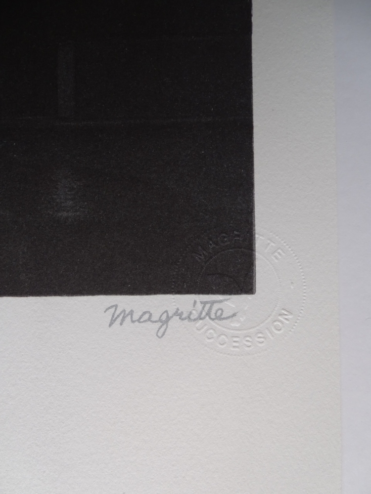 Très belle lithographie colorée et colorée (2010) éditée par l'atelier de Philippe Moreno avec l'autorisation et sous le contrôle de l'ADAGP, qui représente l'héritage de René Magritte. La signature de Magritte est imprimée. L'ouvrage a été paraphé par Charly Herscovici, représentant de la succession Magritte. L'ouvrage est numéroté et contient également des tampons de gaufrage de l'éditeur ADAGP et de la succession de Magritte. L'oeuvre n'a jamais été encadrée et est en très bon état. Le prix galerie pour cette oeuvre est de 1000 à 1500 euros.