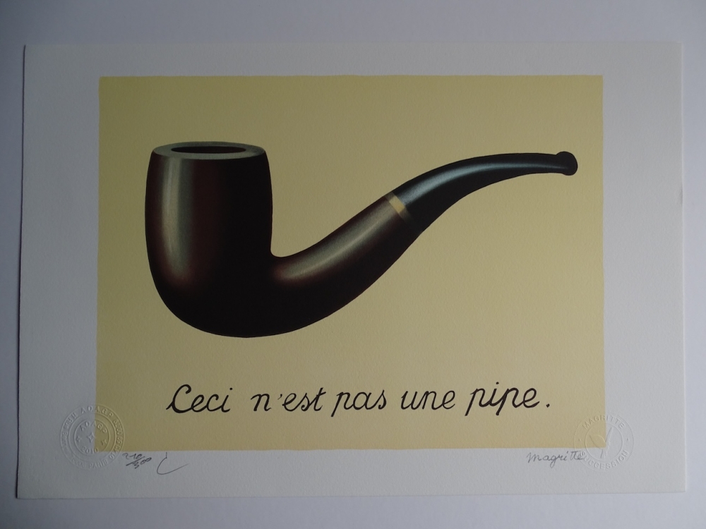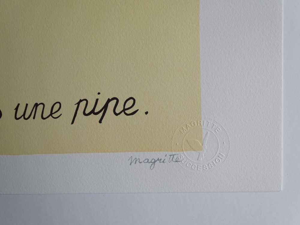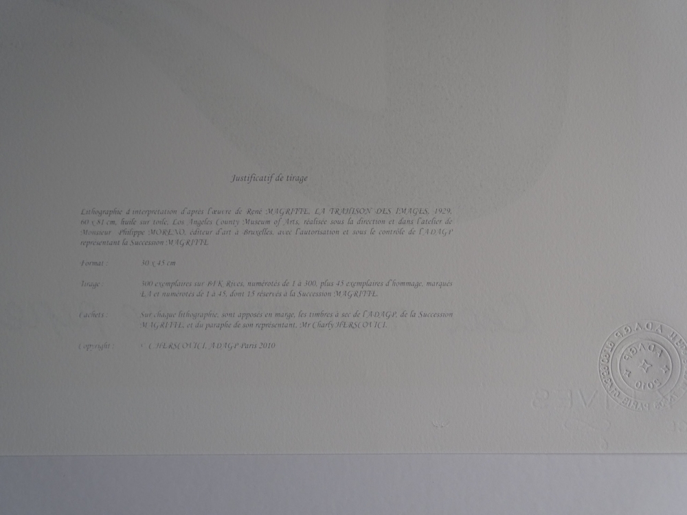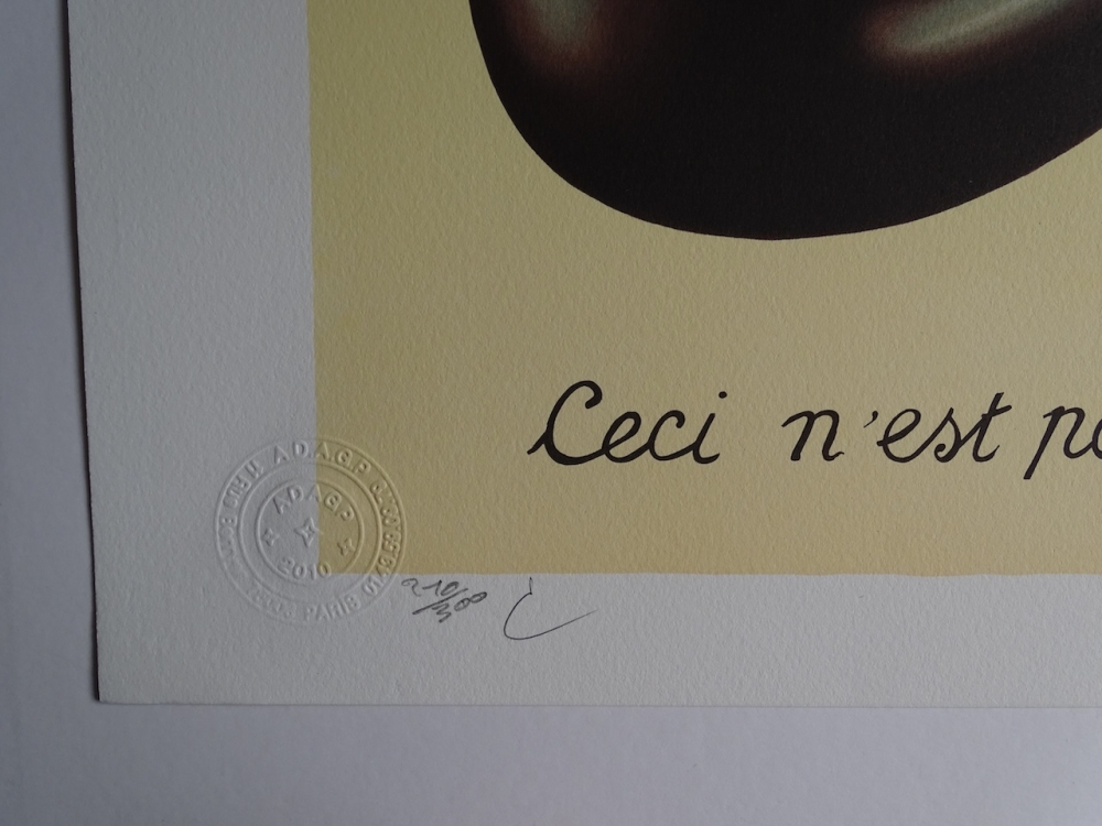 Très belle lithographie colorée et colorée (2010) éditée par l'atelier de Philippe Moreno avec l'autorisation et sous le contrôle de l'ADAGP, qui représente l'héritage de René Magritte. La signature de Magritte est imprimée. L'ouvrage a été paraphé par Charly Herscovici, représentant de la succession Magritte. L'ouvrage est numéroté et contient également des tampons de gaufrage de l'éditeur ADAGP et de la succession de Magritte. L'oeuvre n'a jamais été encadrée et est en très bon état. Le prix galerie pour cette oeuvre est de 1000 à 1500 euros.