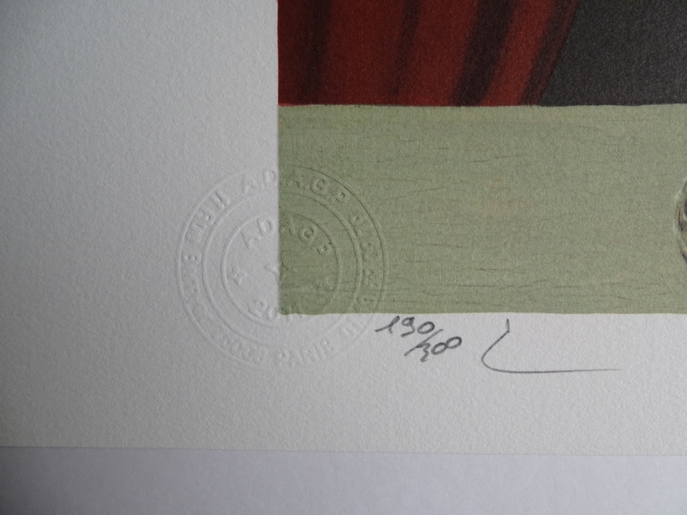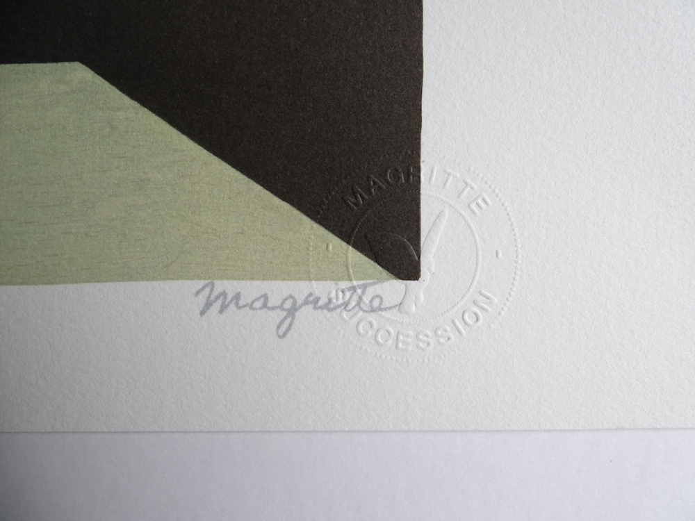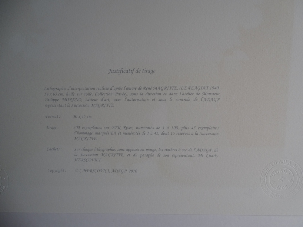 Très belle lithographie colorée et colorée (2010) éditée par l'atelier de Philippe Moreno avec l'autorisation et sous le contrôle de l'ADAGP, qui représente l'héritage de René Magritte. La signature de Magritte est imprimée. L'ouvrage a été paraphé par Charly Herscovici, représentant de la succession Magritte. L'ouvrage est numéroté et contient également des tampons de gaufrage de l'éditeur ADAGP et de la succession de Magritte. L'oeuvre n'a jamais été encadrée et est en très bon état. Le prix galerie pour cette oeuvre est de 1000 à 1500 euros.