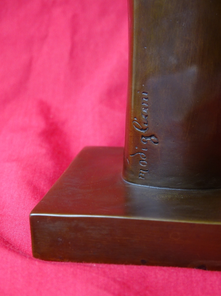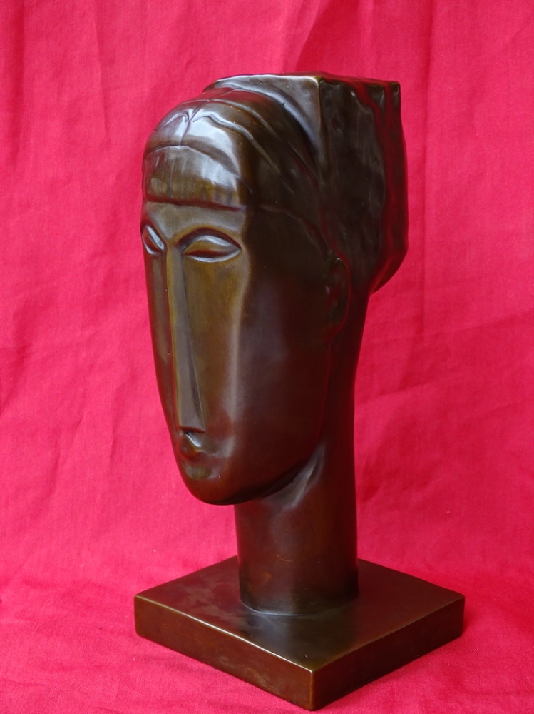 Amedeo Modigliani, d'après, sculpture tête en bronze environ 20cm bonne condition Amedeo Modigliani était un peintre et sculpteur italien qui a travaillé principalement en France. Il est connu pour ses portraits et ses nus dans un style moderne caractérisé par un allongement surréaliste des visages, des cous et des personnages qui n'ont pas été bien accueillis de son vivant, mais qui sont ensuite devenus très recherchés. Modigliani a passé sa jeunesse en Italie, où il a étudié l'art de l'Antiquité et de la Renaissance. En 1906, il s'installe à Paris, où il entre en contact avec des artistes tels que Pablo Picasso et Constantin Brâncuși. En 1912, Modigliani expose des sculptures très stylisées avec des cubistes du groupe de la Section d'Or au Salon d'Automne.