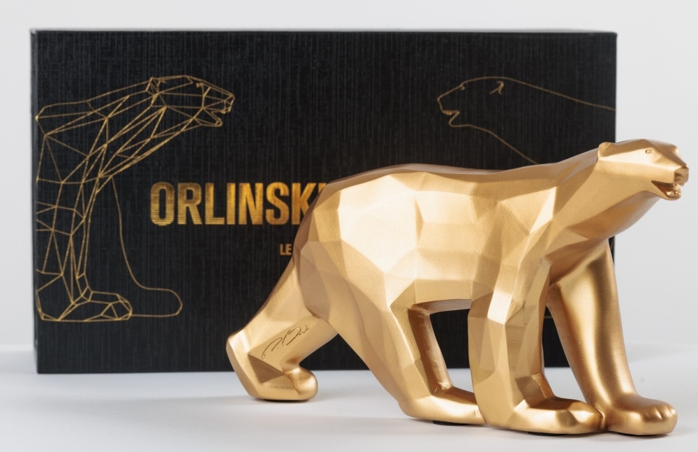 Richard Orlinski avec certificat d'authenticité L'OURS POMPOM x ORLINSKI (OR MAT) Sculpture en résine Richard Orlinski, neuve et déballée, dans sa boite d'origine, avec certificat d'authenticité. Signature gravée de Richard Orlinski et Pompon Édition limitée et épuisée. Un côté lisse et l'autre facetté, cette réinterprétation audacieuse de l'ours emblématique fusionne parfaitement tradition et modernité. (Conseil de R.Orlinski : « Pour préserver la qualité du produit, veillez à ne pas l'exposer au soleil ni à le mettre en contact avec de l'eau. Attention également à ne pas y appliquer de produits chimiques. ») Dimensions : 23 x 12 x 4,5 cm Poids : 1,9 kg (emballage inclus) Matériel: Résine Finition : Or mat Prix galerie : 750-1000 dollars Richard Orlinski est l'artiste contemporain français le plus vendu au monde et fait partie du cercle très fermé des artistes contemporains comme Koons, Hirst et Cattelan. Ses sculptures, articulées autour du concept « Born wild », sont le résultat d'une profonde réflexion sur l'instinct animal et nature humaine. Curieux de la nature et désireux d'exprimer sa sensibilité à travers d'autres disciplines artistiques, il se découvre une passion pour la musique. Orlinski est une référence en art contemporain au même titre que ses amis et collègues tels que Shepard Fairey (Obey), C215, Jef Aérosol, JR, Swoon, Vhils, Felipe Pantone, Denial, , Banksy, Invader, Basquiat, Hirst, Lichtenstein, M.Chat, Sandra Chevrier, Stik, André Saraiva, Jeff Koons, Haring, Imbue, JonOne, Arsham, Stik, M. Brainwash, Kaws, Seth, etc... Expédition mondiale suivie soigneusement emballée.