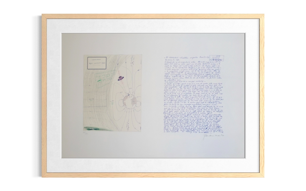 Lithografie op papier. Editie Magneto Statica door Belgisch kunstenaar Panamarenko. Professioneel ingelijst in eiken bak kader. Gesigneerd en genummerd door de kunstenaar. Ophalen of levering binnen België beide mogelijk. Internationale wordt verzekerde zending aangeboden.