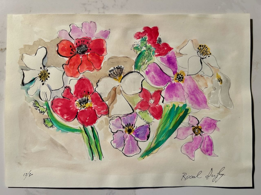 Eau-forte de haute qualité sur papier, rehaussée de gouache et d'aquarelle en petit tirage. numéro 13/30 Très bon état d'origine Raoul Dufy (Le Havre, 3 juin 1877 - Forcalquier, 23 mars 1953) était un peintre fauviste, illustrateur et décorateur français. Biographie Dufy travaille comme comptable chez un importateur de café au Havre dès l'âge de 14 ans. En 1895, parallèlement à ce travail, il suit des cours du soir auprès du peintre Charles Lhullier à l'Ecole des Beaux-Arts du Havre. Il y rencontre le peintre Emile-Othon Friesz. En 1900, Dufy obtient une bourse à l'Ecole des Beaux Arts de Paris, où son ami Friesz était entré avant lui un an plus tôt. Entre les années 1905 et 1909, l'uvre de Dufy connaît une forte influence fauviste. Cependant, cela a changé après son entrée en contact avec l'uvre de Cézanne. Il développe de plus en plus son propre style qui, après un flirt avec le cubisme, prend forme à partir de 1920. Ce style est généralement caractérisé comme sténographique et coloré. En 1938, Dufy réalise l'un des plus grands tableaux du monde à l'Exposition Internationale de Paris. Dufy meurt en 1953 dans la commune de Forcalquier et est inhumé au cimetière du monastère de Cimiez près de Nice.