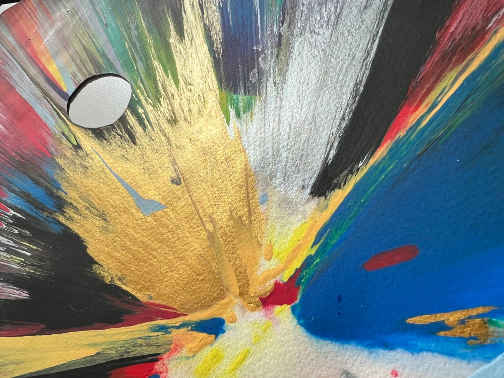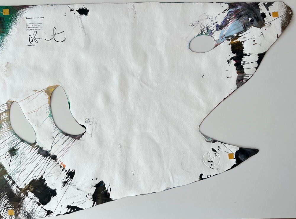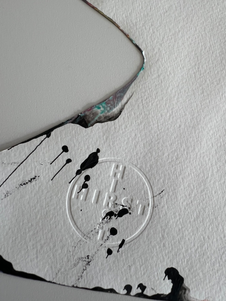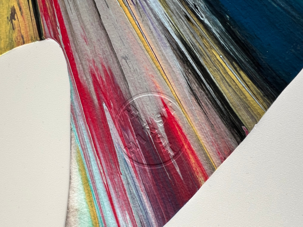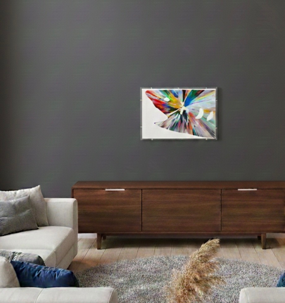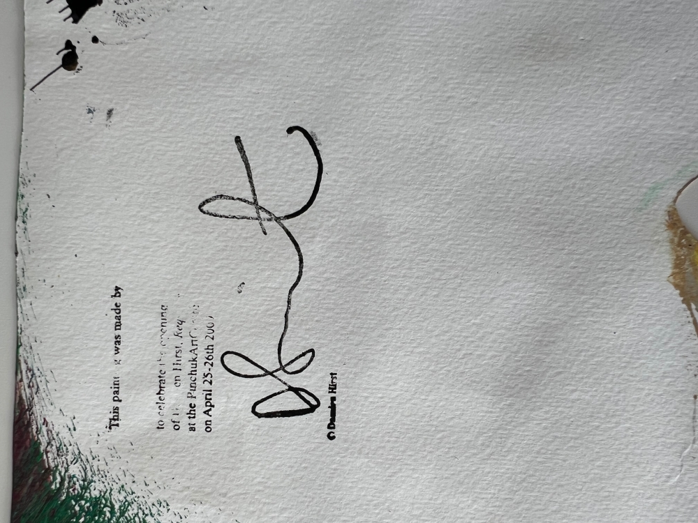 Dit levendige spin-schilderij is van Damien Hirst (geboren 1965 in Bristol woont en werkt in Devon). Gemaakt in 2009 ter gelegenheid van de opening van de grote retrospectieve tentoonstelling Requiem van de kunstenaar in het PinchukArtCentre in Kiev, maakt dit unieke werk deel uit van een oplage die uitsluitend tijdens het evenement werd gedistribueerd en die specifiek is voor de locatie. Uitgevoerd in acryl op stevig, gestanst geweven papier, barst de compositie van centrifugale energie in dieprood, goud, zwart, wit, geel , groen en blauw. De haaienvin-vorm verwijst speels naar een van zijn meest iconische motieven, terwijl het proces een echo is van zijn gemechaniseerde spin machine techniek, die hij ontwikkelde in de jaren negentig. De achterzijde is voorzien van een gedrukte certificaattekst en handtekeningstempel van Damien Hirst, samen met de (c) stempel en een blindstempel in reliëf met "HIRST" rechtsonder. Damien Hirst wordt algemeen beschouwd als een van de meest invloedrijke hedendaagse kunstenaars van zijn generatie, vooral bekend om zijn conceptuele en provocerende werk, waarin hij vaak thema's als leven, dood en transformatie verkent. Hij verwierf bekendheid als een leidende figuur van de Young British Artists (YBAs), naast Tracey Emin, Marc Quinn, Sarah Lucas, Gary Hume, Chris Ofili, en Jake & Dinos Chapman. Zijn werk resoneert met de tradities van Pop Art en conceptualisme, en vindt echo's bij invloeden zoals Andy Warhol, Francis Bacon, Jeff Koons, Julian Schnabel, Takashi Murakami en Gerhard Richter.