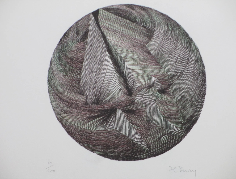 Litho door Pol Bury Voorstelling van een abstractie in lijnenspel Losbladig, beeldmaat 20x20, bladmaat 75x55 Gesigneerd in potlood r.o.: 'PL Bury' Pol BURY (Haine-Saint-Pierre 1922 - Parijs 2005) Schilder, beeldhouwer Opleiding: Pol Bury volgde teken- en decoratielessen aan de Academie voor Schone Kunsten in Bergen. Woonde en werkte in verschillende plaatsen ter wereld, waaronder Bergen, Parijs en Japan.
