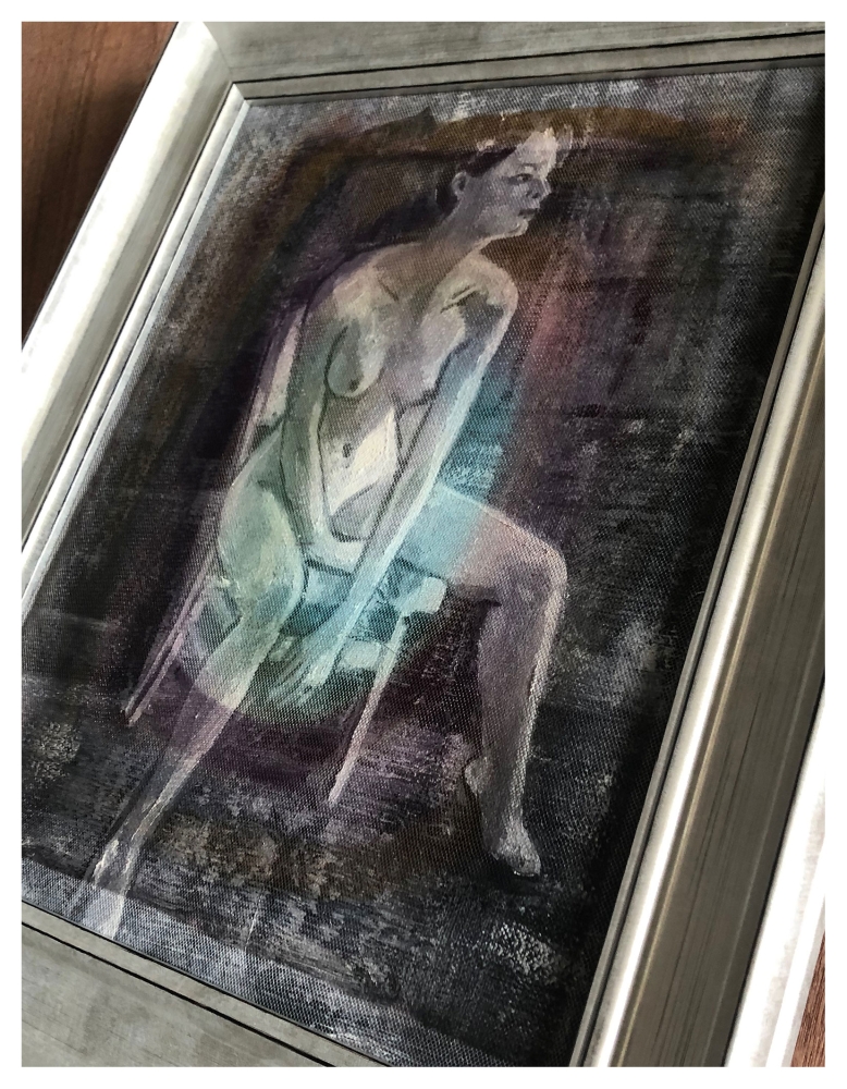 Ce travail est une peinture à l'huile avec une grille avec de la peinture aérographe à l'avant. Cela crée une dimension supplémentaire.