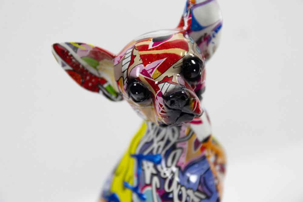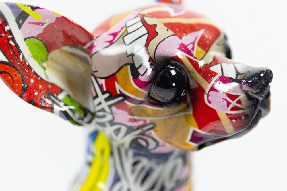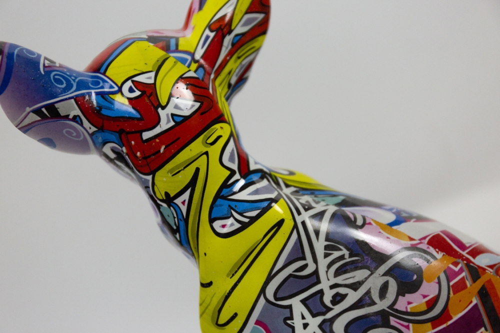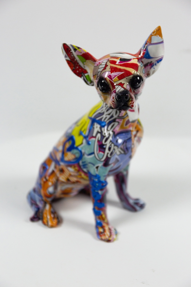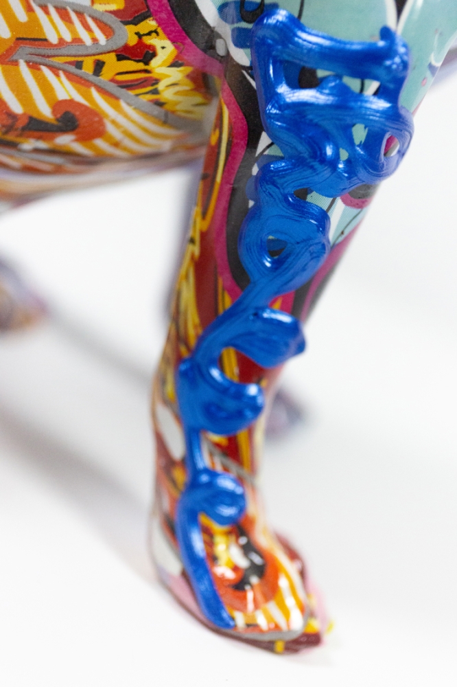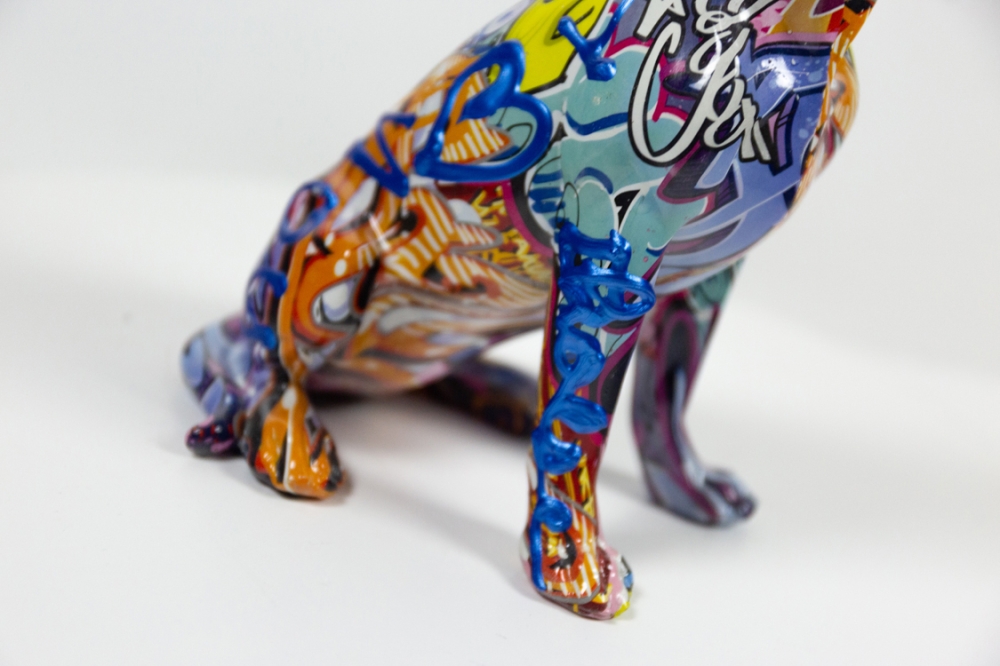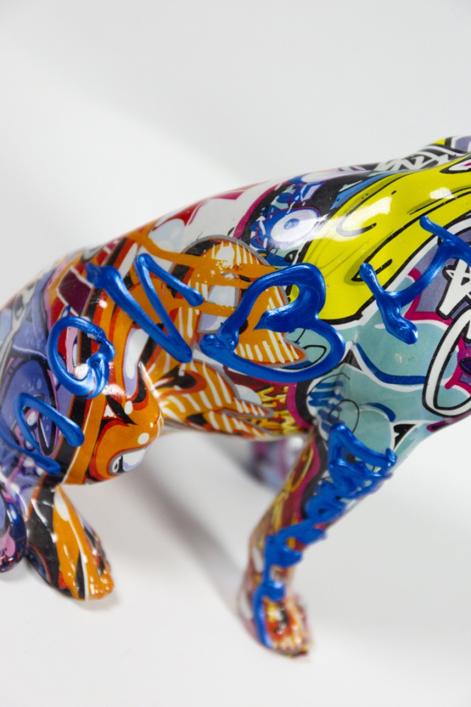 Petite sculpture en résine synthétique par Hannes D'Haese. Cette sculpture a probablement été traitée avec une impression par transfert d'eau et ensuite peinte à la peinture acrylique dans le style typique de Hannes.