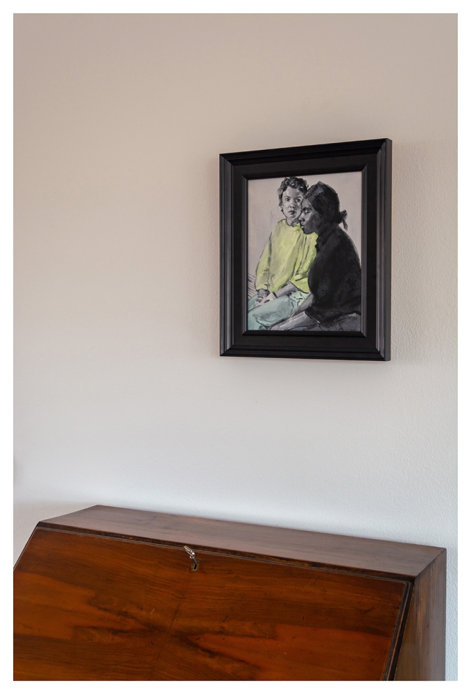 La conversation est une peinture à l'huile sur lin. C'est une rencontre et une conversation entre deux femmes. C'est une image en noir et blanc avec un peu de couleur. Le tout est encadré d'un cadre noir de 5 cm de large.